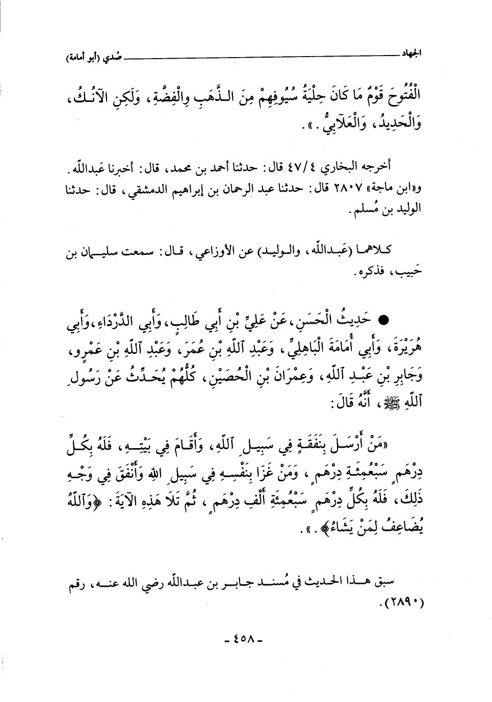 مَنْ أَرْسَلَ بِنَفَقَةٍ فِى سَبِيلِ اللَّهِ , وَأَقَامَ فِى بَيْتِهِ , فَلَهُ بِكُلِّ دِرْهَمٍ سَبْعُمِائَةِ دِرْهَمٍ , وَمَنْ غَزَا بِنَفْسِهِ فِى سَبِيلِ اللَّهِ وَأَنْفَقَ فِى وَجْهِ ذَلِكَ , فَلَهُ بِكُلِّ دِرْهَمٍ سَبْعُمِائَةِ أَلْفِ دِرْهَمٍ , ثُمَّ تَلَا هَذِهِ الآيَةَ: (وَاللَّهُ يُضَاعِفُ لِمَنْ يَشَاءُ).