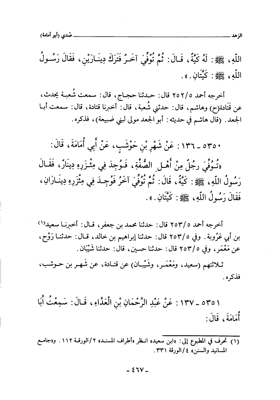 ٥٣٥٠ - عَنْ شَهْرِ بْنِ حَوْشَبٍ عَنْ أَبِى أُمَامَةَ الْحِمْصِىِّ قَالَ: