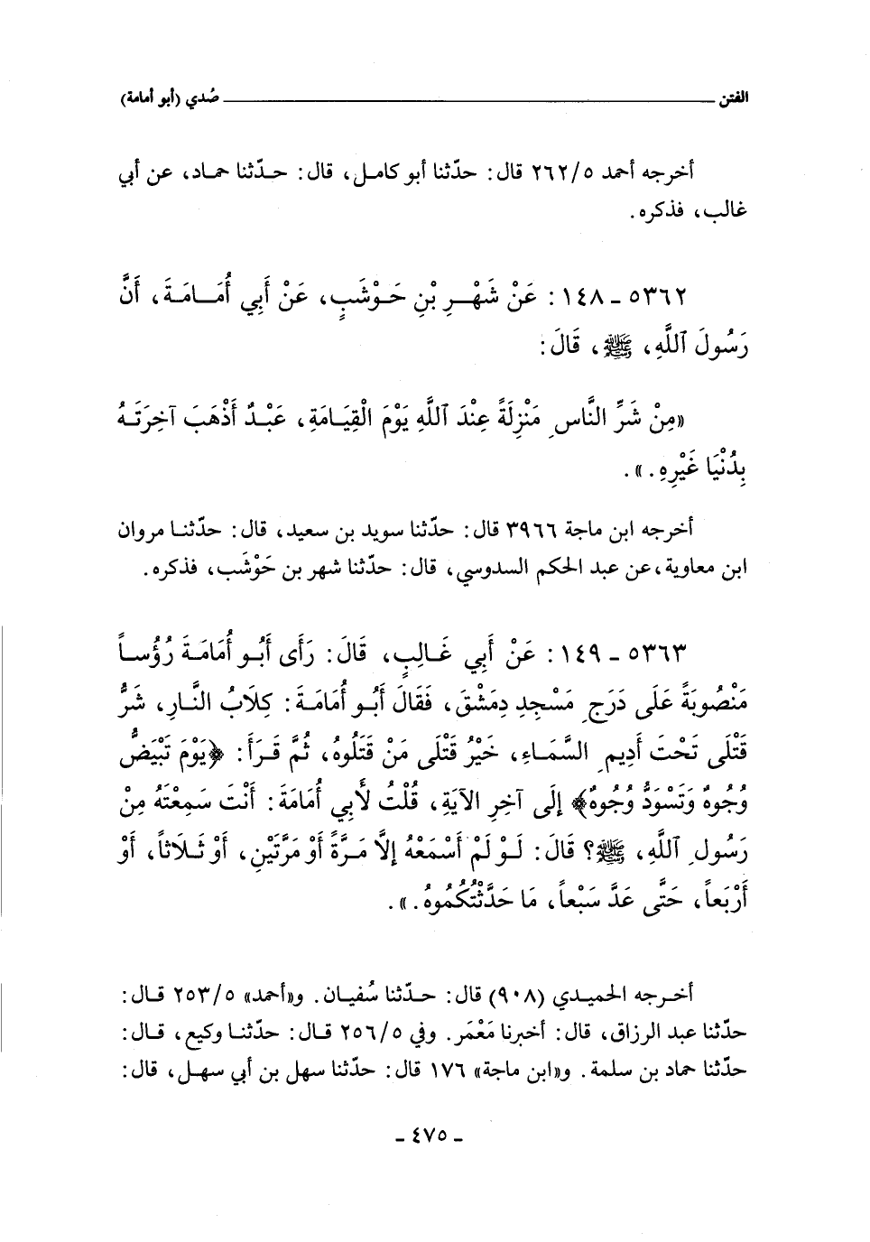 ٥٣٦٢ - عَنْ شَهْرِ بْنِ حَوْشَبٍ عَنْ أَبِى أُمَامَةَ أَنَّ رَسُولَ اللَّهِ صلى الله عليه وسلم قَالَ: