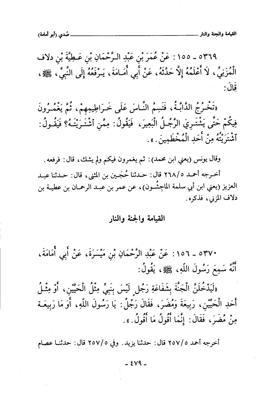 ٥٣٦٩ - عَنْ عُمَرَ بْنِ عَبْدِ الرَّحْمَانِ بْنِ عَطِيَّةَ بْنِ دِلَافٍ الْمُزَنِىِّ لَا أَعْلَمُهُ إِلَاّ حَدَّثَهُ عَنْ أَبِى أُمَامَةَ يَرْفَعُهُ إِلَى النَّبِىِّ صلى الله عليه وسلم قَالَ: