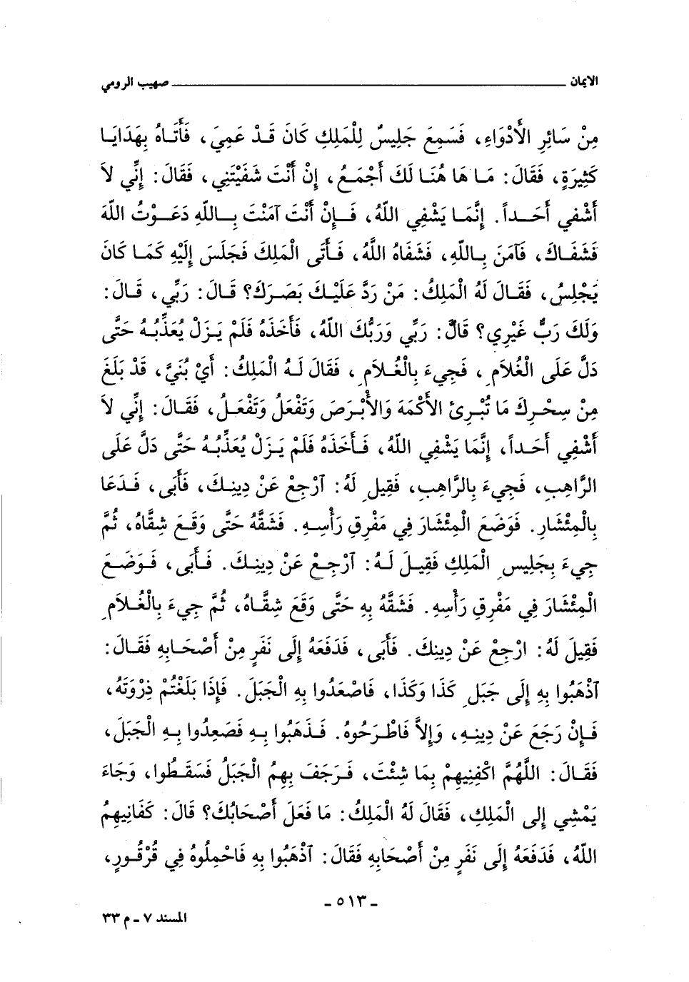 دَعَوْتُ الله فَشَفَاكَ. فَآمَنَ بِالله فَشَفَاهُ الله فَأَتَى الْمَلِكَ فَجَلَسَ إِلَيْهِ كَمَا كَانَ يَجْلِسُ فَقَالَ لَهُ الْمَلِكُ: مَنْ رَدَّ عَلَيْكَ بَصَرَكَ؟ قَالَ: رَبِّى. قَالَ: وَلَكَ رَبٌّ غَيْرِى؟ قَالَ: رَبِّى وَرَبُّكَ الله. فَأَخَذَهُ فَلَمْ يَزَلْ يُعَذِّبُهُ حَتَّى دَلَّ عَلى الْغُلَامِ فَجِئَ بِالْغُلَامِ فَقَالَ لَهُ الْمَلِكُ: أَىْ بُنَىَّ قَدْ بَلَغَ مِنْ سِحْرِكَ مَا تُبْرِئُ الأَكْمَهَ وَالأَبْرَصَ وَتَفْعَلُ وَتَفْعَلُ. فَقَالَ: إِنِّى لَا أَشْفِى أَحَدًا إِنَّمَا يَشْفِى الله. فَأَخَذَهُ فَلَمْ يَزَلْ يُعَذِّبُهُ حَتَّى دَلَّ عَلَى الرَّاهِبِ فَجِئَ بِالرَّاهِبِ فَقِيلَ: لَهُ ارْجِعْ عَنْ دِينِكَ. فَأَبَى فَدَعَا بِالْمِئْشَارِ فَوَضَعَ الْمِئْشَارَ فِى مَفْرِقِ رَأْسِهِ فَشَقَّهُ حَتَّى وَقَعَ شِقَّاهُ ثُمَّ جِئَ بِجَلِيسِ الْمَلِكِ فَقِيلَ لَهُ: ارْجِعْ عَنْ دِينِكَ. فَأَبَى فَوَضَعَ الْمِئْشَارَ فِى مَفْرِقِ رَأْسِهِ فَشَقَّهُ بِهِ حَتَّى وَقَعَ شِقَّاهُ ثُمَّ جِئَ بِالْغُلَامِ فَقِيلَ لَهُ ارْجِعْ عَنْ دِينِكَ. فَأَبَى فَدَفَعَهُ إِلَى نَفَرٍ مِنْ أَصْحَابِهِ فَقَالَ اذْهَبُوا بِهِ إِلَى جَبَلِ كَذَا وَكَذَا فَاصْعَدُوا بِهِ الْجَبَلَ فَإِذَا بَلَغْتُمْ ذُرْوَتَهُ فَإِنْ رَجَعَ عَنْ دِينِهِ وَإِلَاّ فَاطْرَحُوهُ فَذَهَبُوا بِهِ فَصَعِدُوا بِهِ الْجَبَلَ فَقَالَ: اللهمَّ اكْفِنِيهِمْ بِمَا شِئْتَ. فَرَجَفَ بِهِمُ الْجَبَلُ فَسَقَطُوا وَجَاءَ يَمْشِى إِلَى الْمَلِكِ فَقَالَ لَهُ الْمَلِكُ: مَا فَعَلَ أَصْحَابُكَ؟ قَالَ: كَفَانِيهِمُ الله. فَدَفَعَهُ إِلَى نَفَرٍ مِنْ أَصْحَابِهِ فَقَالَ: اذْهَبُوا بِهِ فَاحْمِلُوهُ فِى قُرْقُورٍ