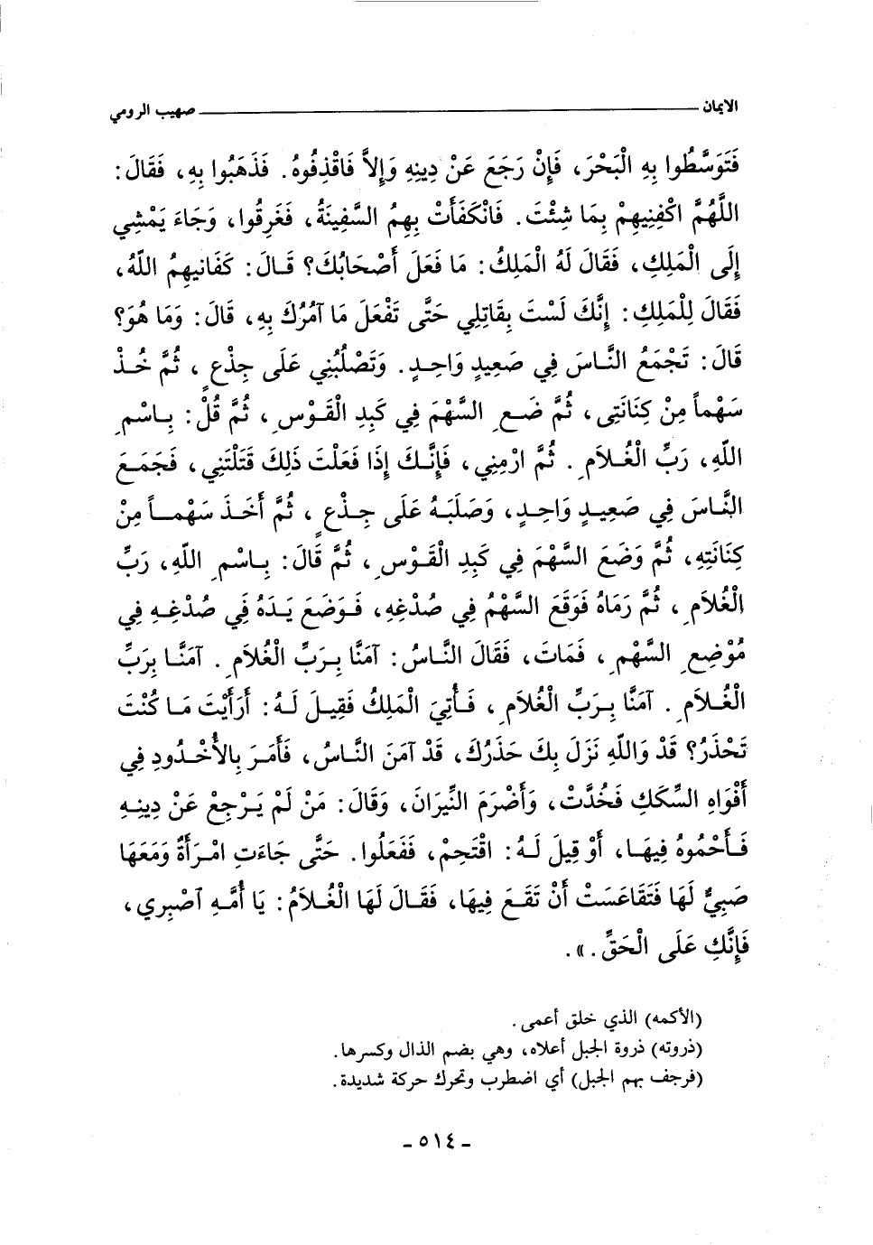فَقَالَ: اللهمَّ اكْفِنِيهِمْ بِمَا شِئْتَ. فَانْكَفَأَتْ بِهِمُ السَّفِينَةُ فَغَرِقُوا وَجَاءَ يَمْشِى إِلَى الْمَلِكِ فَقَالَ لَهُ الْمَلِكُ: مَا فَعَلَ أَصْحَابُكَ؟ قَالَ: كَفَانِيهِمُ الله. فَقَالَ لِلْمَلِكِ: إِنَّكَ لَسْتَ بِقَاتِلِى حَتَّى تَفْعَلَ مَا آمُرُكَ بِهِ. قَالَ: وَمَا هُوَ؟ قَالَ: تَجْمَعُ النَّاسَ فِى صَعِيدٍ وَاحِدٍ وَتَصْلُبُنِى عَلَى جِذْعٍ ثُمَّ خُذْ سَهْمًا مِنْ كِنَانَتِى ثُمَّ ضَعِ السَّهْمَ فِى كَبِدِ الْقَوْسِ ثُمَّ قُلْ بِاسْمِ الله رَبِّ الْغُلَامِ. ثُمَّ ارْمِنِى فَإِنَّكَ إِذَا فَعَلْتَ ذَلِكَ قَتَلْتَنِى. فَجَمَعَ النَّاسَ فِى صَعِيدٍ وَاحِدٍ وَصَلَبَهُ عَلَى جِذْعٍ ثُمَّ أَخَذَ سَهْمًا مِنْ كِنَانَتِهِ ثُمَّ وَضَعَ السَّهْمَ فِى كَبِدِ الْقَوْسِ ثُمَّ قَالَ: بِاسْمِ الله رَبِّ الْغُلَامِ. ثُمَّ رَمَاهُ فَوَقَعَ السَّهْمُ فِى صُدْغِهِ فَوَضَعَ يَدَهُ فِى صُدْغِهِ فِى مَوْضِعِ السَّهْمِ فَمَاتَ فَقَالَ النَّاسُ: آمَنَّا بِرَبِّ الْغُلَامِ آمَنَّا بِرَبِّ الْغُلَامِ آمَنَّا بِرَبِّ الْغُلَامِ. فَأُتِىَ الْمَلِكُ فَقِيلَ لَهُ: أَرَأَيْتَ مَا كُنْتَ تَحْذَرُ قَدْ وَالله نَزَلَ بِكَ حَذَرُكَ قَدْ آمَنَ النَّاسُ. فَأَمَرَ بِالأُخْدُودِ فِى أَفْوَاهِ السِّكَكِ فَخُدَّتْ وَأَضْرَمَ النِّيرَانَ وَقَالَ مَنْ لَمْ يَرْجِعْ عَنْ دِينِهِ فَأَحْمُوهُ فِيهَا. أَوْ قِيلَ لَهُ اقْتَحِمْ. فَفَعَلُوا حَتَّى جَاءَتِ امْرَأَةٌ وَمَعَهَا صَبِىٌّ لَهَا فَتَقَاعَسَتْ أَنْ تَقَعَ فِيهَا فَقَالَ لَهَا الْغُلَامُ: يَا أُمَّهِ اصْبِرِى فَإِنَّكِ عَلَى الْحَقِّ.