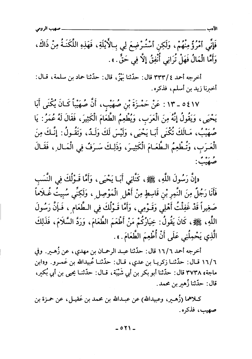 ٥٤١٧ - عَنْ حَمْزَةَ بْنِ صُهَيْبٍ، أَنَّ صُهَيْبًا كَانَ يُكَنَّى أَبَا يَحْيَى، وَيَقُولُ إِنَّهُ مِنَ الْعَرَبِ، وَيُطْعِمُ الطَّعَامَ الْكَثِيرَ، فَقَالَ لَهُ عُمَرُ: يَا صُهَيْبُ، مَا لَكَ تُكَنَّى أَبَا يَحْيَى، وَلَيْسَ لَكَ وَلَدٌ، وَتَقُولُ: إِنَّكَ مِنَ الْعَرَبِ، وَتُطْعِمُ الطَّعَامَ الْكَثِيرَ، وَذَلِكَ سَرَفٌ فِى الْمَالِ، فَقَالَ صُهَيْبٌ: