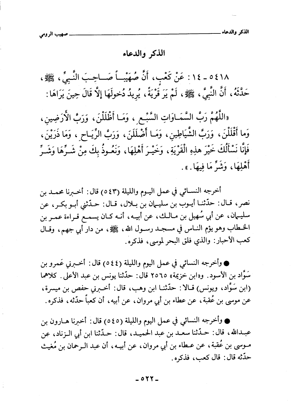 أَنَّ النَّبِيِّ، صلى الله عليه وسلم، لَمْ يَرَ قَرْيَةً، يُرِيدُ دُخُولَهَا إِلَاّ قَالَ حِينَ يَرَاهَا: اللهمَّ رَبَّ السَّمَاوَاتِ السَّبْعِ , وَمَا أَظْلَلْنَ، وَرَبَّ الأَرَضِينَ، وَمَا أَقْلَلْنَ، وَرَبَّ الشَّيَاطِينِ، وَمَا أَضْلَلْنَ، وَرَبَّ الرِّيَاحِ، وَمَا ذَرَيْنَ، فَإِنَّا نَسْألُكَ خَيْرَ هَذِهِ الْقَرْيَةِ، وَخَيرَ أَهْلِهَا، وَنَعُوذُ بِكَ مِن شَرِّهَا وَشَرِّ أَهْلِهَا، وَشَرِّ مَا فِيهَا.