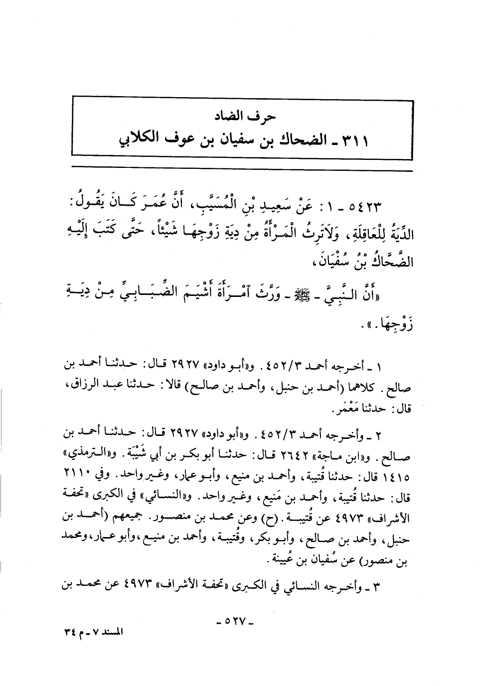 ٥٤٢٣ - عَنْ سَعِيدٍ بْنِ الْمُسَيَّبِ، أَنَّ عُمَرَ كَانَ يَقُولُ: الدِّيَةُ لِلْعَاقِلَةِ وَلَا تَرِثُ الْمَرْأَةُ مِنْ دِيَةِ زَوْجِهَا شَيْئًا، حَتَّى كَتَبَ إِلَيْهِ الضَّحَّاكُ بْنُ سُفيان.