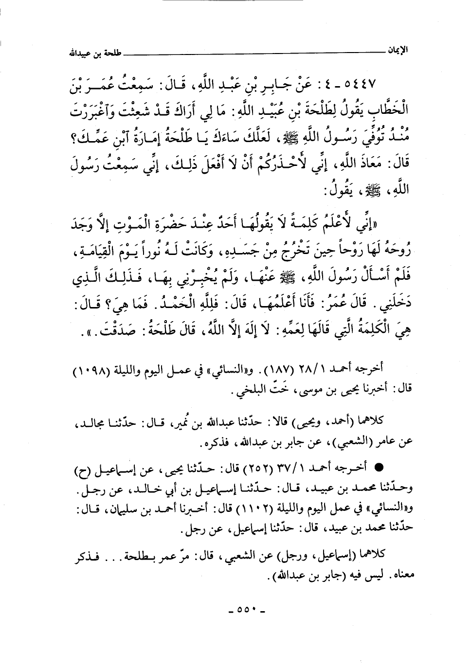 إِنِّى لأَعْلَمُ كَلِمَةً لَا يَقُولُهَا رَجُلٌ عِنْدَ حَضْرَةِ الْمَوْتِ إِلَاّ وَجَدَ رُوحَهُ لَهَا رَوْحًا حِينَ تَخْرُجُ مِنْ جَسَدِهِ وَكَانَتْ لَهُ نُورًا يَوْمَ الْقِيَامَةِ فَلَمْ أَسْأَلْ رَسُولَ الله صلى الله عليه وسلم عَنْهَا وَلَمْ يُخْبِرْنِى بِهَا فَذَلِكَ الَّذِى دَخَلَنِى قَالَ عُمَرُ فَأَنَا أَعْلَمُهَا. قَالَ فَلِلَّهِ الْحَمْدُ فَمَا هِىَ قَالَ هِىَ الْكَلِمَةُ الَّتِى قَالَهَا لِعَمِّهِ لَا إِلَهَ إِلَاّ الله قَالَ طَلْحَةُ صَدَقْتَ.