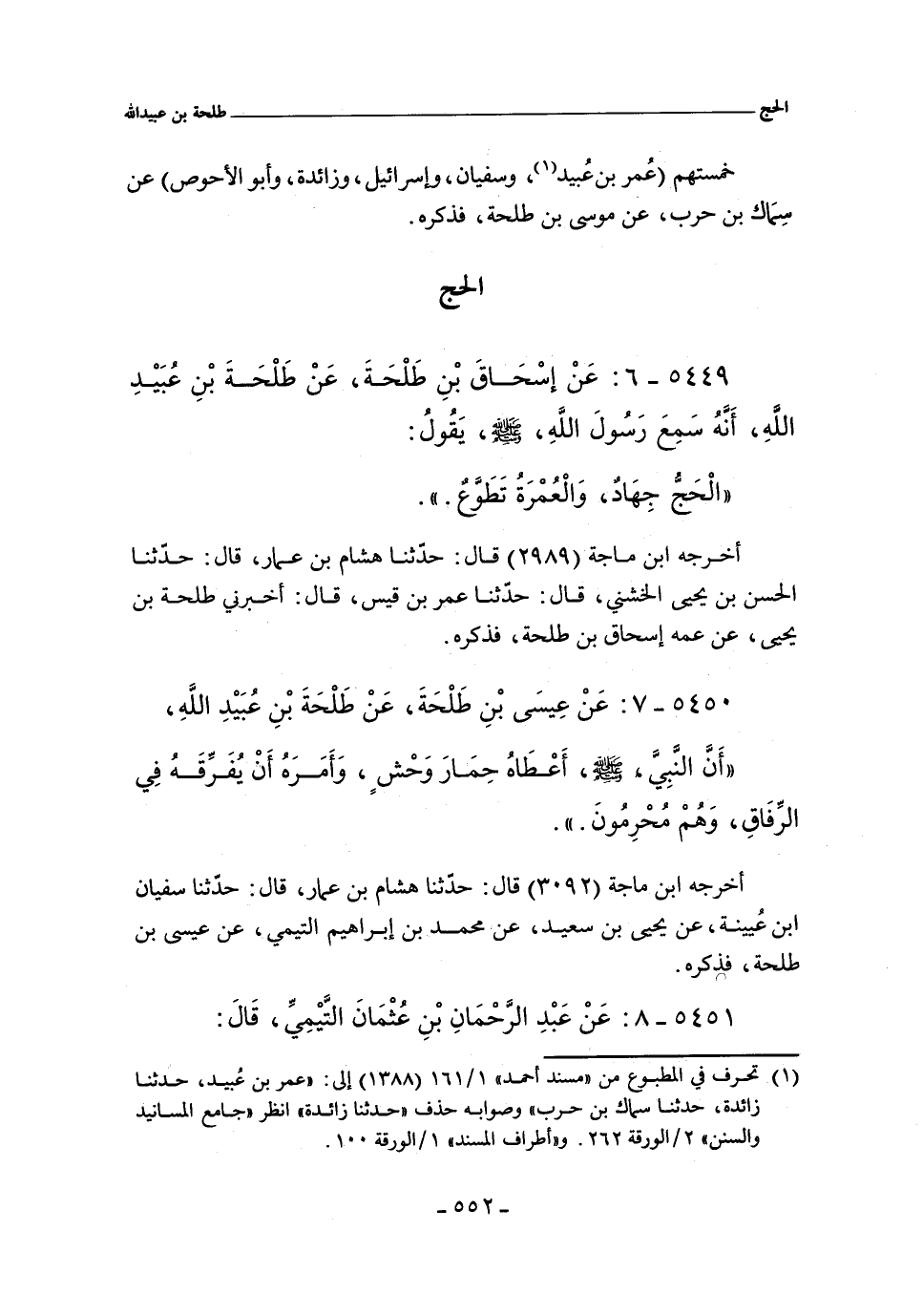 ٥٤٥٠ - عَنْ عِيسَى بْنِ طَلْحَةَ عَنْ طَلْحَةَ بْنِ عُبَيْدِ الله ,
