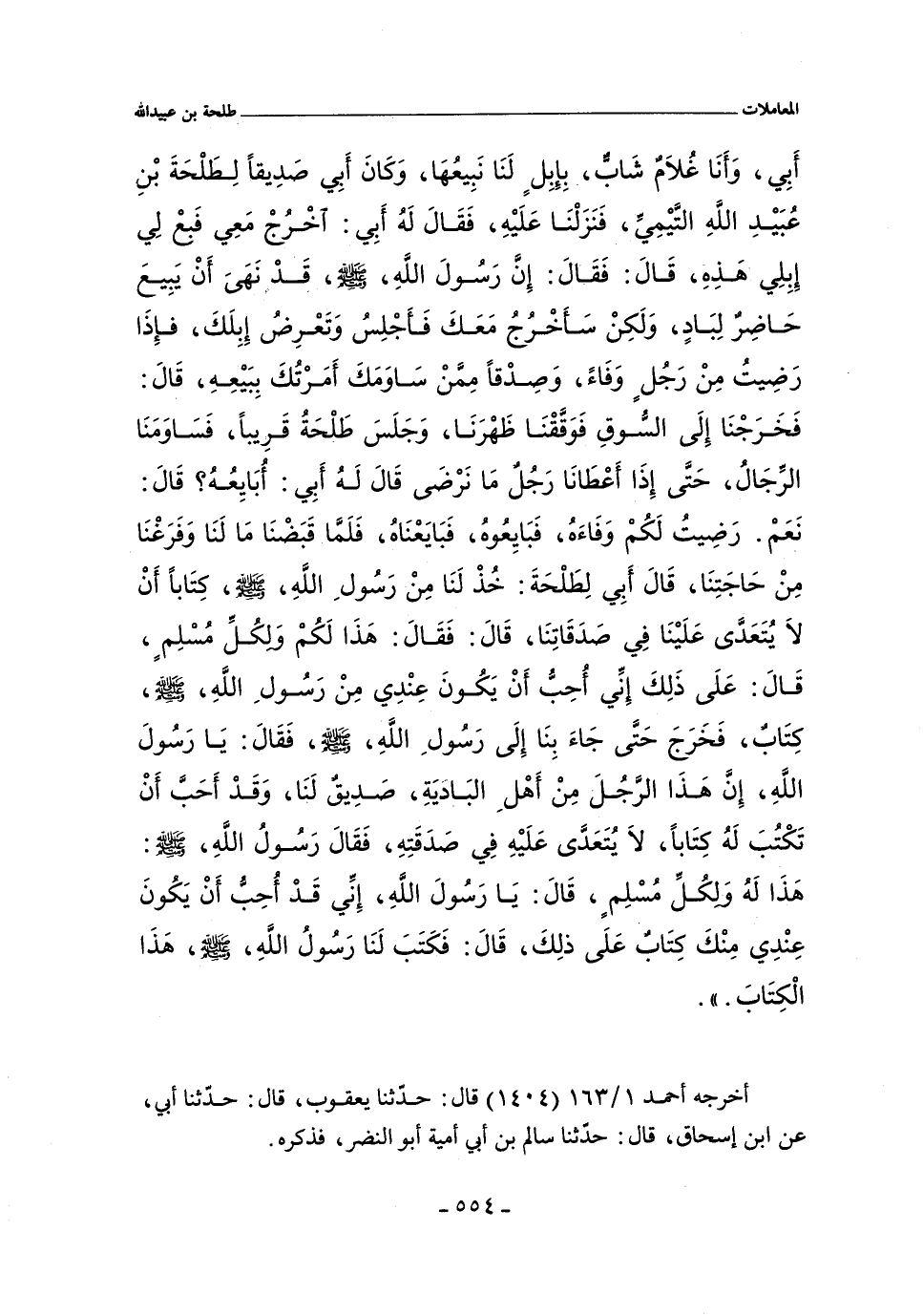 أَبِى وَأَنَا غُلَامٌ شَابٌّ بِإِبِلٍ لَنَا نَبِيعُهَا وَكَانَ أَبِى صَدِيقالطَلْحَةَ بْنِ عُبَيْدِ الله التَّيْمِىِّ فَنَزَلْنَا عَلَيْهِ فَقَالَ لَهُ أَبِى اخْرُجْ مَعِى فَبِعْ لِى إِبِلِى هَذِهِ. قَالَ فَقَالَ إِنَّ رَسُولَ الله صلى الله عليه وسلم قَدْ نَهَى أَنْ يَبِيعَ حَاضِرٌ لِبَادٍ وَلَكِنْ سَأَخْرُجُ مَعَكَ فَأَجْلِسُ وَتَعْرِضُ إِبِلَكَ فَإِذَا رَضِيتُ مِنْ رَجُلٍ وَفَاءً وَصِدْقًا مِمَّنْ سَاوَمَكَ أَمَرْتُكَ بِبَيْعِهِ. قَالَ فَخَرَجْنَا إِلَى السُّوقِ فَوَقَفْنَا ظَهْرَنَا وَجَلَسَ طَلْحَةُ قَرِيبًا فَسَاوَمَنَا الرِّجَالُ حَتَّى إِذَا أَعْطَانَا رَجُلٌ مَا نَرْضَى قَالَ لَهُ أَبِى أُبَايِعُهُ قَالَ نَعَمْ قَدْ رَضِيتُ لَكُمْ وَفَاءَهُ فَبَايِعُوهُ. فَبَايَعْنَاهُ فَلَمَّا قَبَضْنَا مَالَنَا وَفَرَغْنَا مِنْ حَاجَتِنَا قَالَ أَبِى لِطَلْحَةَ خُذْ لَنَا مِنْ رَسُولِ الله صلى الله عليه وسلم كِتَابًا أَنْ لَا يُتَعَدَّى عَلَيْنَا فِى صَدَقَاتِنَا قَالَ فَقَالَ هَذَا لَكُمْ وَلِكُلِّ مُسْلِمٍ قَالَ عَلَى ذَلِكَ إِنِّى أُحِبُّ أَنْ يَكُونَ عِنْدِى مِنْ رَسُولِ الله صلى الله عليه