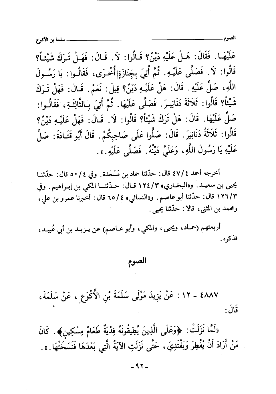 عَلَيْهَا. فقَالَ: هل عليه دين؟ قالوا: لا. قال: فهَلْ تَرَكَ شَيْئًا؟ قَالُوا: لَا. فَصَلَّى عَلَيْهِ. ثُمَّ أُتِىَ بِجَنَازَةٍ أخرى , فَقَالَوا: يا رسول الله , صل عليها. قال: هل عليه دين. قيل: نعم. قال: فهَلْ تَرَكَ شيئا. قالول: ثلاثة دنانير. قال: صلوا على صاحبكم. قال أبو قتادة: صل عليه يا رسول الله , وعلي دينه , فصلى عليه.