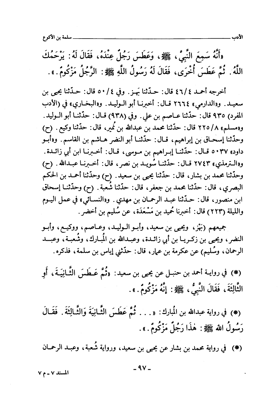 أخرجه أحمد ٤/ ٤٦ (١٦٦١٥) قال: حدثنا بهز. وفي ٤/ ٥٠ (١٦٦٤٤) قال: حدثنا يحيى بن سعيد. و"الدارمي" ٢٦٦١ قال: أخبرنا أبو الوليد. و"البُخَارِي" في (الأدب المفرد) ٩٣٥ قال: حدثنا عاصم بن علي. وفي (٩٣٨) قال: حدثنا أبو الوليد. و"مسلم" ٨/ ٢٢٥ (٧٥٩٨) قال: حدثنا محمد بن عبد الله بن نُمير، حدثنا وَكِيع (ح) وحدثنا إسحاق بن إبراهيم، حدثنا أبو النضر هاشم بن القاسم. و"أبو داود" ٥٠٣٧ قال: حدثنا إبراهيم بن موسى، أخبرنا ابن أَبي زائدة. والتِّرْمِذِيّ" ٢٧٤٣ قال: حدثنا سُويد بن نَصر، أخبرنا عبد الله (ح) وحذثنا محمد بن بشار، حدثنا يحيى بن سعيد (ح) وحدثنا أحمد بن الحكم البصري، حدثنا محمد بن جعفر، قال: حدثنا شُعبة (ح) وحدثنا إسحاق بن منصور، حدثنا عبد الرحمن بن مَهدي. و"النَّسَائي" في "عمل اليوم والليلة" ٢٢٣ قال: أخبرنا حُميد بن مَسعدة، عن سُليم، وهو ابن أخضر.