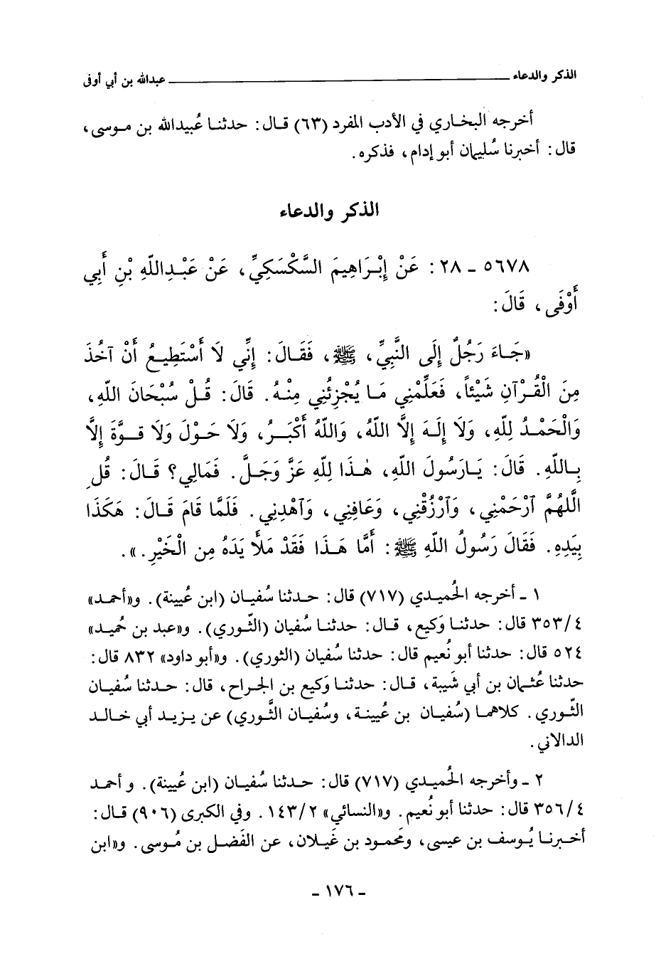 جَاءَ رَجُلٌ إِلَى النَّبِىِّ صلى الله عليه وسلم فَقَالَ إِنِّى لَا أَسْتَطِيعُ أَنْ آخُذَ مِنَ الْقُرْآنِ شَيْئًا فَعَلِّمْنِى مَا يُجْزِئُنِى مِنْهُ قَالَ قُلْ سُبْحَانَ اللَّهِ وَالْحَمْدُ لِلَّهِ وَلَا إِلَهَ إِلَاّ اللَّهُ وَاللَّهُ أَكْبَرُ وَلَا حَوْلَ وَلَا قُوَّةَ إِلَاّ بِاللَّهِ قَالَ يَا رَسُولَ اللَّهِ هَذَا لِلَّهِ عَزَّ وَجَلَّ فَمَا لِى قَالَ قُلِ اللَّهُمَّ ارْحَمْنِى وَارْزُقْنِى وَعَافِنِى وَاهْدِنِى فَلَمَّا قَامَ قَالَ هَكَذَا بِيَدِهِ فَقَالَ رَسُولُ اللَّهِ صلى الله عليه وسلم أَمَّا هَذَا فَقَدْ مَلأَ يَدَهُ مِنَ الْخَيْرِ.
