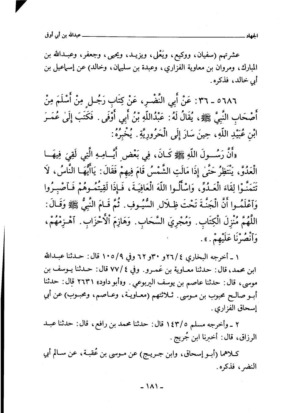 ٥٦٨٦ - عَنْ أَبِى النَّضْرِ عَنْ كِتَابِ رَجُلٍ مِنْ أَسْلَمَ مِنْ أَصْحَابِ النَّبِىِّ صلى الله عليه وسلم يُقَالُ لَهُ عَبْدُ اللَّهِ بْنُ أَبِى أَوْفَى فَكَتَبَ إِلَى عُمَرَ بْنِ عُبَيْدِ اللَّهِ حِينَ سَارَ إِلَى الْحَرُورِيَّةِ يُخْبِرُهُ؛