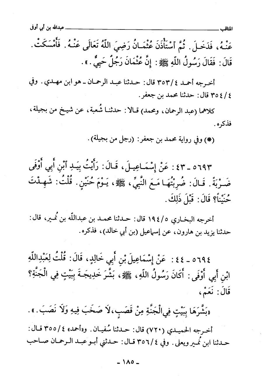 - حديث سُفيان بن عُيَينَة، عن إسماعيل بن أبي خالد، قال:. وَأَرَانَا ابن أبي أوفى ضربةَ أصابته مع النبي صلى الله عليه وسلم يوم حنينِ، سلف برقم (٦٢٨٥.