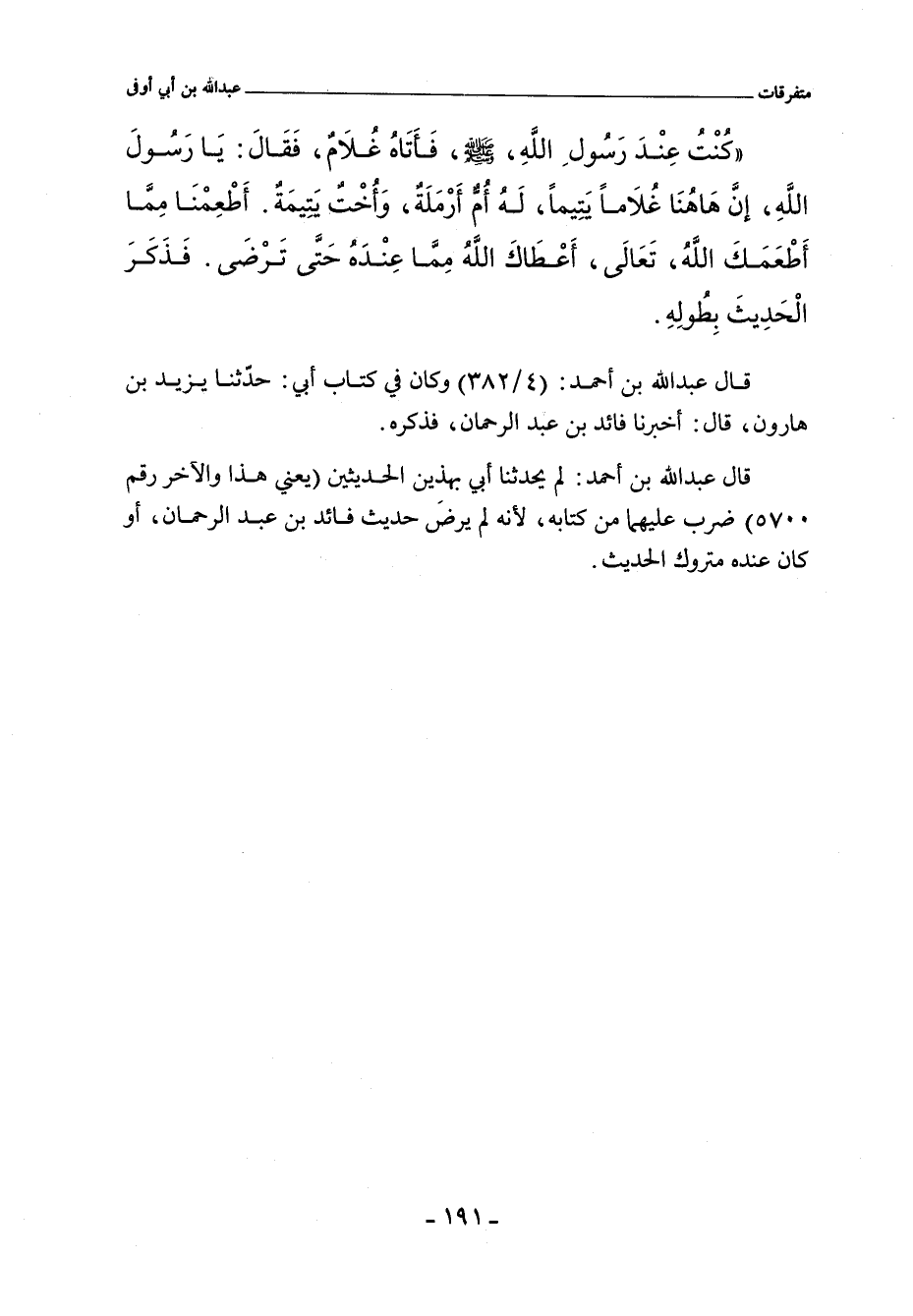 قال عبد الله بن أحمد: فلم يحدث أبي بهدين الحديثين (يعني هذا والآخر رقم ٦٣٠٠) ضرب عليهما من كتابه، لأنه لم يرضَ حديث فائد بن عبد الرحمن، وكان عنده متروك الحديث.