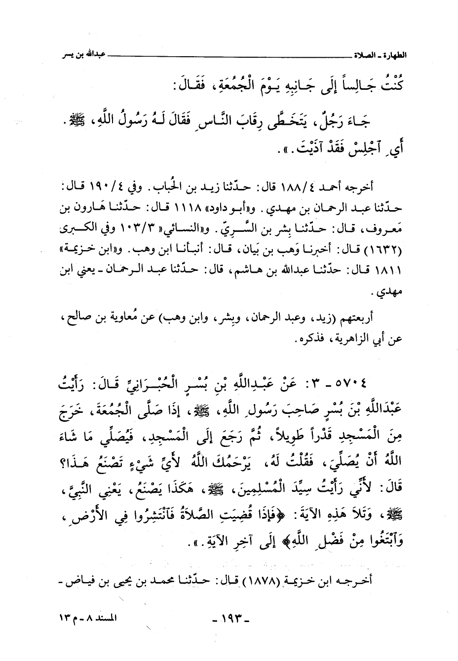 ٥٧٠٤ - عَن عَبدِ اللهِ بْنِ بُسرٍ الحُبرَانِي. قَالَ: رَأَيتُ عبد الله بْنَ بُسرٍ صَاحِبَ رَسُولِ الله، صلى الله عليه وسلم، إِذَا صَلَّى الجُمُعَةَ، خَرَجَ مِنَ الْمَسجِدِ قَدرًا طَوِيلاً، ثُم رَجَعَ إِلَى الْمَسجِدِ، فَيُصَلِّي مَا شَاءَ اللهُ أَنْ يصَلي، فَقُلْتُ لَهُ، يَرحمُكَ الله، لأيِّ شَيءٍ تَصْنَعُ هَذَ؟ قَالَ: لأني رَأَيْتُ سَيدَ الْمُسلِمِينَ، صلى الله عليه وسلم، هَكَذَا يَصْنَعُ، يَعْنِي النبِي، صلى الله عليه وسلم، وَتَلَا هَذِهِ الآيَةَ: (فَإِذَا قُضِيَتِ الصلَاةُ فَاَنتَشِرُوا فِي الأرضِ، وَاَبْتَغُوا مِنْ فَضْلِ الله) إِلَى آخِرِ الآيَةِ.