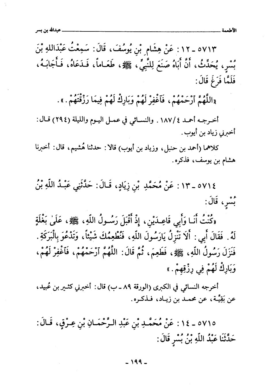 ٥٧١٣ - عَنْ هِشَامِ بْنِ يُوسُفَ قَالَ سَمِعْتُ عَبْدَ اللَّهِ بْنَ بُسْرٍ يُحَدِّثُ أَنَّ أَبَاهُ صَنَعَ لِلنَّبِىِّ صلى الله عليه وسلم طَعَامًا فَدَعَاهُ فَأَجَابَهُ فَلَمَّا فَرَغَ قَالَ: