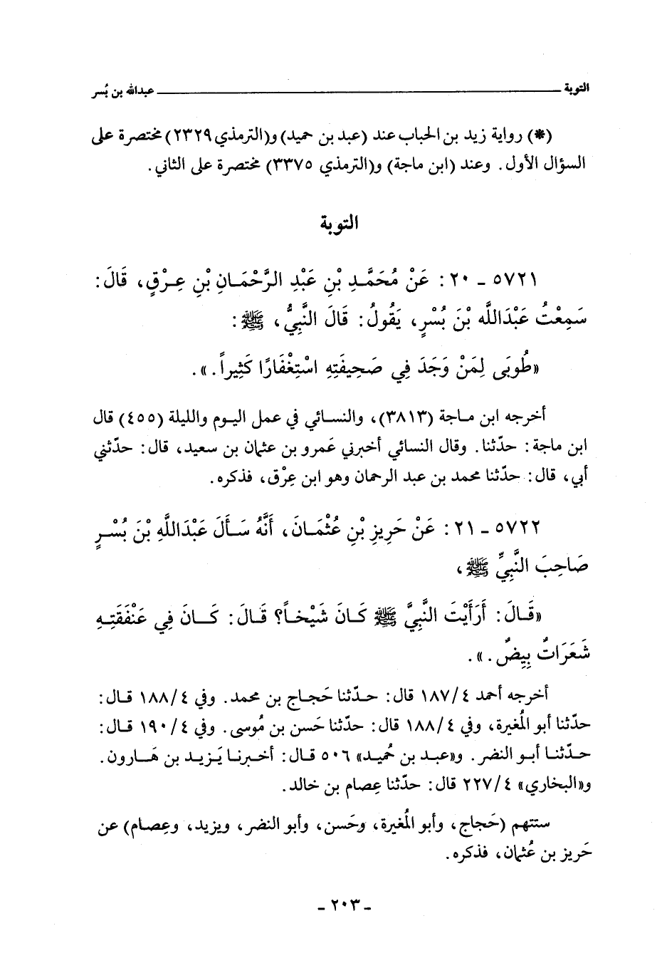 - في رواية حجاج بن محمد: عن حريز بن عُثمان. قال: كنا غلمانا جلوسًا عند عبد الله بن بسر , وكان من أصحاب النبي، صلى الله عليه وسلم، ولم نكن نُحسن نسأله، فقلت. فذكر الحديث.