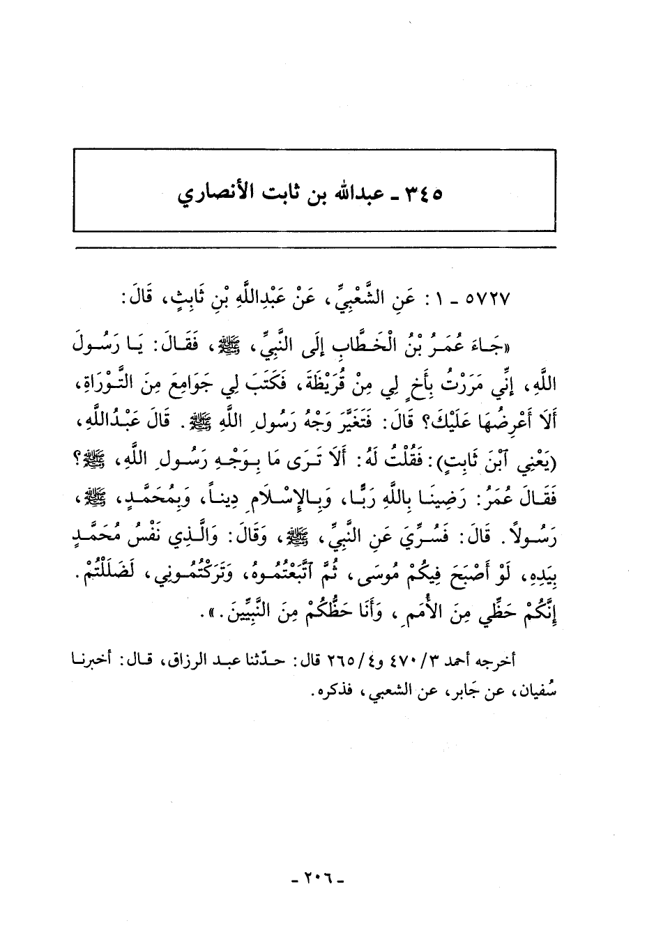 جَاءَ عُمَرُ بْنُ الْخَطَّابِ إِلَى النَّبِىِّ صلى الله عليه وسلم فَقَالَ يَا رَسُولَ اللَّهِ إِنِّى مَرَرْتُ بِأَخٍ لِى مِنْ قُرَيْظَةَ فَكَتَبَ لِى جَوَامِعَ مِنَ التَّوْرَاةِ أَلَا أَعْرِضُهَا عَلَيْكَ قَالَ فَتَغَيَّرَ وَجْهُ رَسُولِ اللَّهِ صلى الله عليه وسلم قَالَ عَبْدُ اللَّهِ فَقُلْتُ لَهُ أَلَا تَرَى مَا بِوَجْهِ رَسُولِ اللَّهِ صلى الله عليه وسلم فَقَالَ عُمَرُ رَضِينَا بِاللَّهِ رَبًّا وَبِالإِسْلَامِ دِينًا وَبِمُحَمَّدٍ صلى الله عليه وسلم رَسُولاً قَالَ فَسُرِّىَ عَنِ النَّبِىِّ صلى الله عليه وسلم ثُمَّ قَالَ وَالَّذِى نَفْسِى بِيَدِهِ لَوْ أَصْبَحَ فِيكُمْ مُوسَى ثُمَّ اتَّبَعْتُمُوهُ وَتَرَكْتُمُونِى لَضَلَلْتُمْ إِنَّكُمْ حَظِّى مِنَ الأُمَمِ وَأَنَا حَظُّكُمْ مِنَ النَّبِيِّينَ.