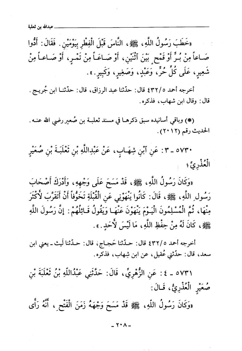٥٧٣٠ - عَنِ ابْنِ شِهَابٍ، عَنْ عَبْدِ اللَّهِ بْنِ ثَعْلَبَةَ بْنِ صُعَيْرٍ الْعُذْرِيِّ وَكَانَ رَسُولُ اللَّهِ صلى الله عليه وسلم قَدْ مَسَحَ عَلَى وَجْهِهِ، وَأَدْرَكَ أَصْحَابَ رَسُولِ اللَّهِ صلى الله عليه وسلم، قَالَ: