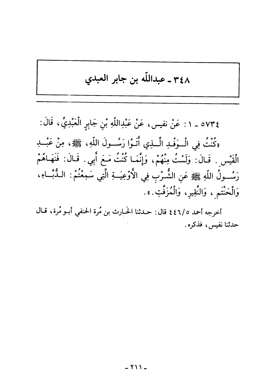 كُنْتُ فِى الْوَفْدِ الَّذِى أَتَوْا رَسُولَ اللَّهِ , صلى الله عليه وسلم , مِنْ عَبْدِ الْقَيْسِ. قَالَ: وَلَسْتُ مِنْهُمْ , وَإِنَّمَا كُنْتُ مَعَ أَبِى. قَالَ: فَنَهَاهُمْ رَسُولُ اللَّهِ , صلى الله عليه وسلم , عَنِ الشُّرْبِ فِى الأَوْعِيَةِ الَّتِى سَمِعْتُمُ: الدُّبَّاءِ , وَالْحَنْتَمِ , وَالنَّقِيرِ , وَالْمُزَفَّتِ.