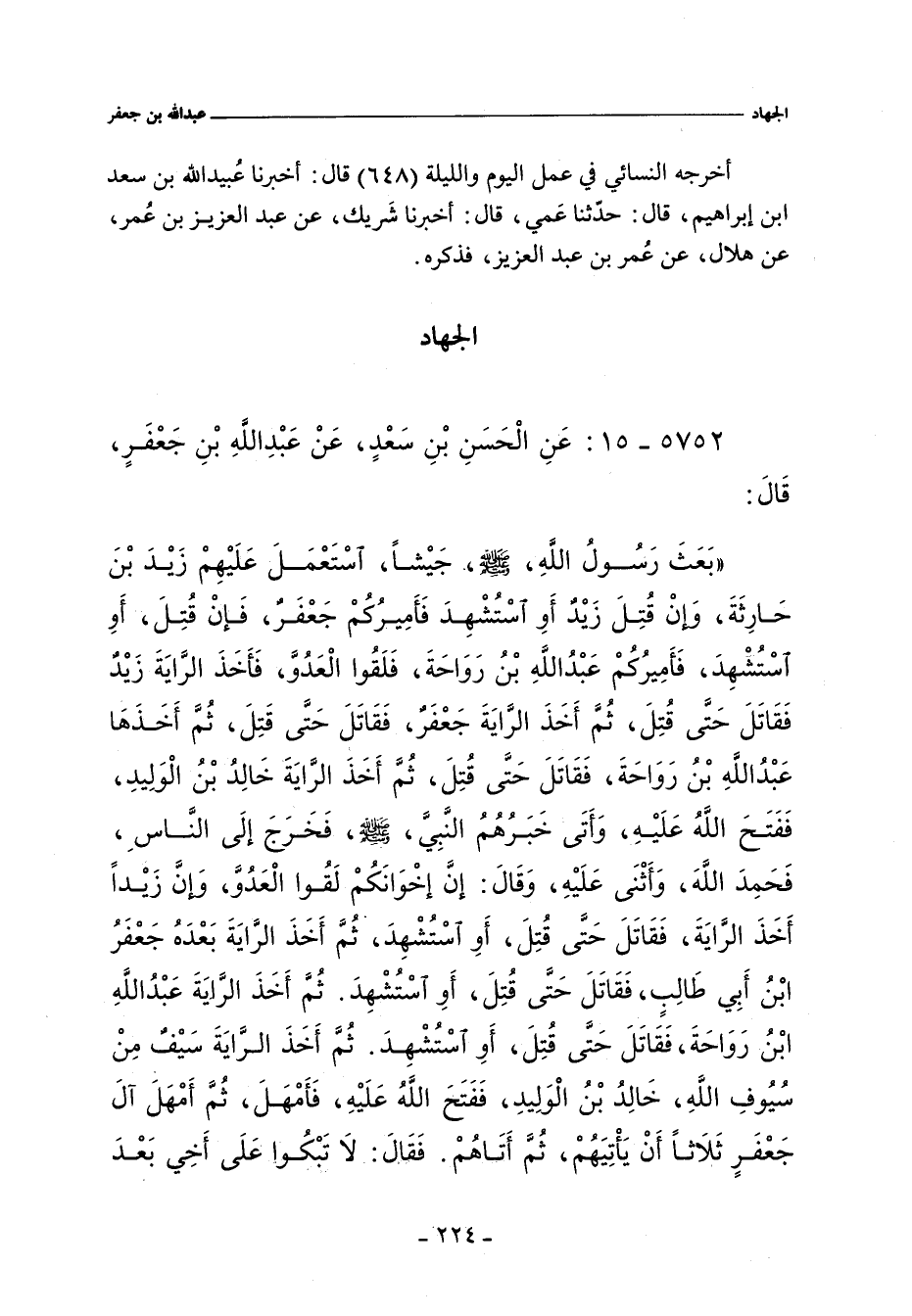 بَعَثَ رَسُولُ اللَّهِ صلى الله عليه وسلم جَيْشًا اسْتَعْمَلَ عَلَيْهِمْ زَيْدَ بْنَ حَارِثَةَ وَقَالَ فَإِنْ قُتِلَ زَيْدٌ أَوِ اسْتُشْهِدَ فَأَمِيرُكُمْ جَعْفَرٌ فَإِنْ قُتِلَ أَوِ اسْتُشْهِدَ فَأَمِيرُكُمْ عَبْدُ اللَّهِ بْنُ رَوَاحَةَ فَلَقُوا الْعَدُوَّ فَأَخَذَ الرَّايَةَ زَيْدٌ فَقَاتَلَ حَتَّى قُتِلَ ثُمَّ أَخَذَ الرَّايَةَ جَعْفَرٌ فَقَاتَلَ حَتَّى قُتِلَ ثُمَّ أَخَذَهَا عَبْدُ اللَّهِ بْنُ رَوَاحَةَ فَقَاتَلَ حَتَّى قُتِلَ ثُمَّ أَخَذَ الرَّايَةَ خَالِدُ بْنُ الْوَلِيدِ فَفَتَحَ اللَّهُ عَلَيْهِ وَأَتَى خَبَرُهُمُ النَّبِىَّ صلى الله عليه وسلم فَخَرَجَ إِلَى النَّاسِ فَحَمِدَ اللَّهَ وَأَثْنَى عَلَيْهِ وَقَالَ إِنَّ إِخْوَانَكُمْ لَقُوا الْعَدُوَّ وَإِنَّ زَيْدًا أَخَذَ الرَّايَةَ فَقَاتَلَ حَتَّى قُتِلَ أَوِ اسْتُشْهِدَ ثُمَّ أَخَذَ الرَّايَةَ بَعْدَهُ جَعْفَرُ بْنُ أَبِى طَالِبٍ فَقَاتَلَ حَتَّى قُتِلَ أَوِ اسْتُشْهِدَ ثُمَّ أَخَذَ الرَّايَةَ عَبْدُ اللَّهِ بْنُ رَوَاحَةَ فَقَاتَلَ حَتَّى قُتِلَ أَوِ اسْتُشْهِدَ ثُمَّ أَخَذَ الرَّايَةَ سَيْفٌ مِنْ سُيُوفِ اللَّهِ خَالِدُ بْنُ الْوَلِيدِ فَفَتَحَ اللَّهُ عَلَيْهِ فَأَمْهَلَ ثُمَّ أَمْهَلَ آلَ جَعْفَرٍ ثَلَاثًا أَنْ يأتيهُمْ ثُمَّ أَتَاهُمْ فَقَالَ لَا تَبْكُوا عَلَى أَخِى بَعْدَ