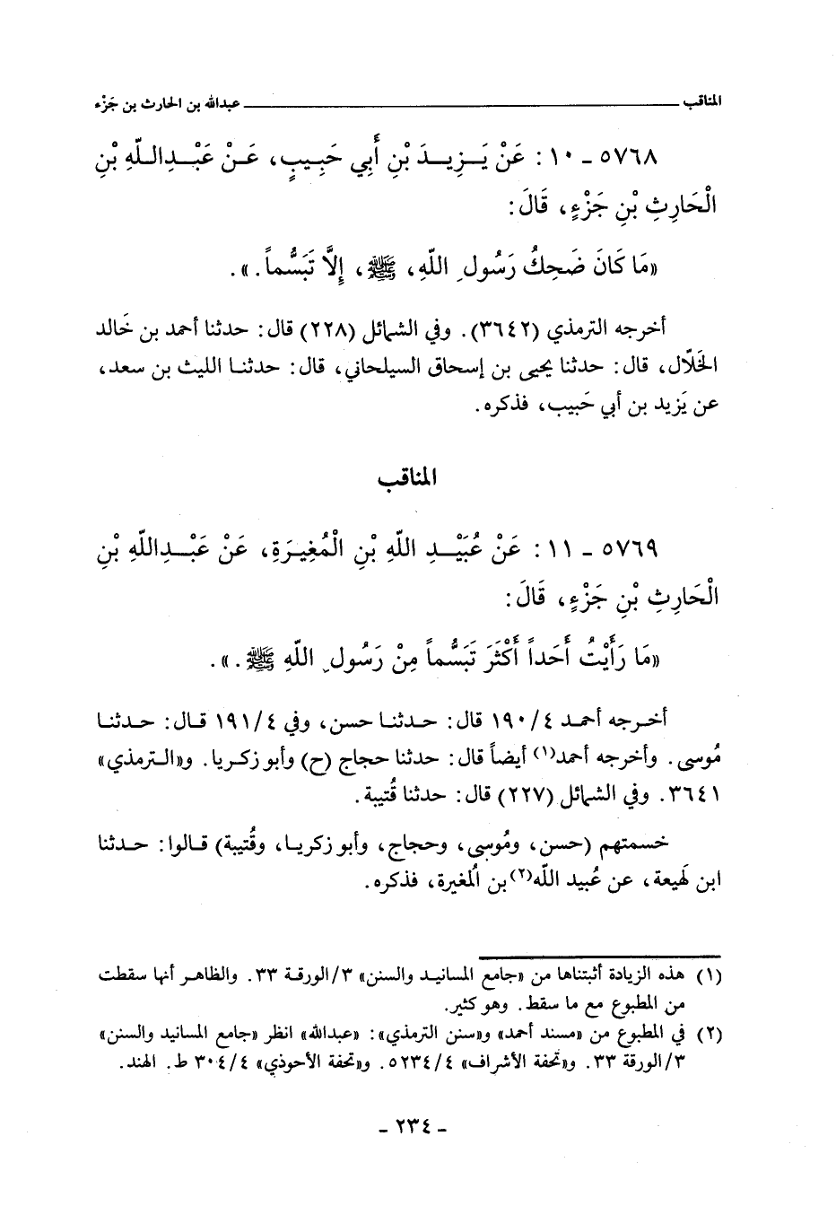 ٥٧٦٨ - عَنْ يَزِيدَ بْنِ أَبِى حَبِيبٍ عَنْ عَبْدِ اللَّهِ بْنِ الْحَارِثِ بْنِ جَزْءٍ قَالَ: