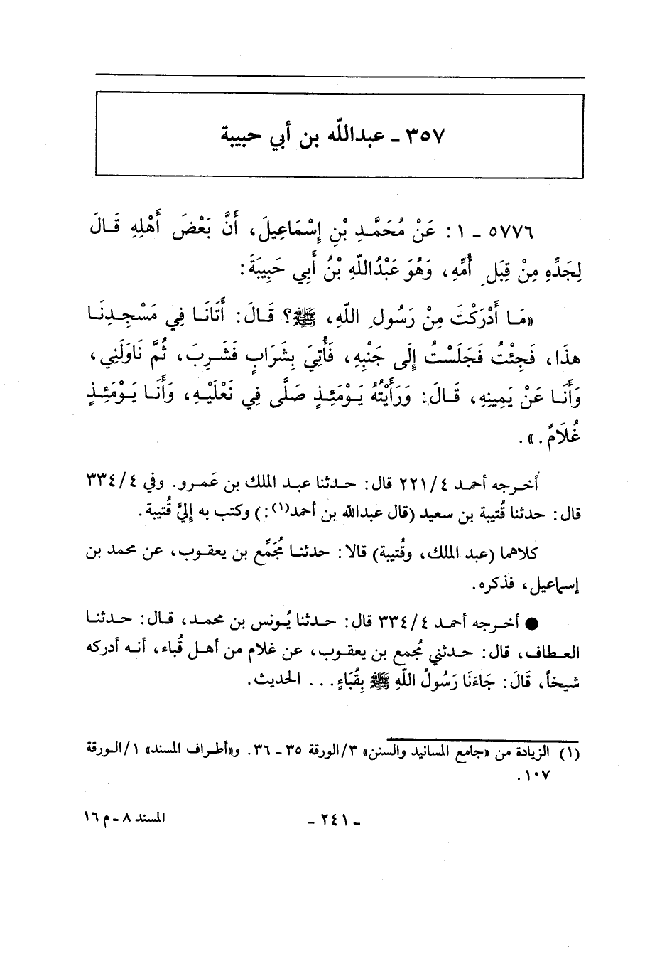 - أخرجه أحمد ٣/ ٥٠٢ (١٦١٧٩) و ٤/ ٣٣٤ (١٩١٦٠) قال: حَدَّثَنَا يُونُسُ بْنُ مُحَمَّدٍ. قَالَ: حَدَّثَنَا الْعَطَّافُ. قَالَ: حَدَّثَنِى بْنُ يَعْقُوبَ , عَنْ غُلَامٍ مِنْ أَهْلِ قُبَاءٍ , أَنَّهُ أَدْرَكَهُ شَيْخًا , أَنَّهُ قَالَ: