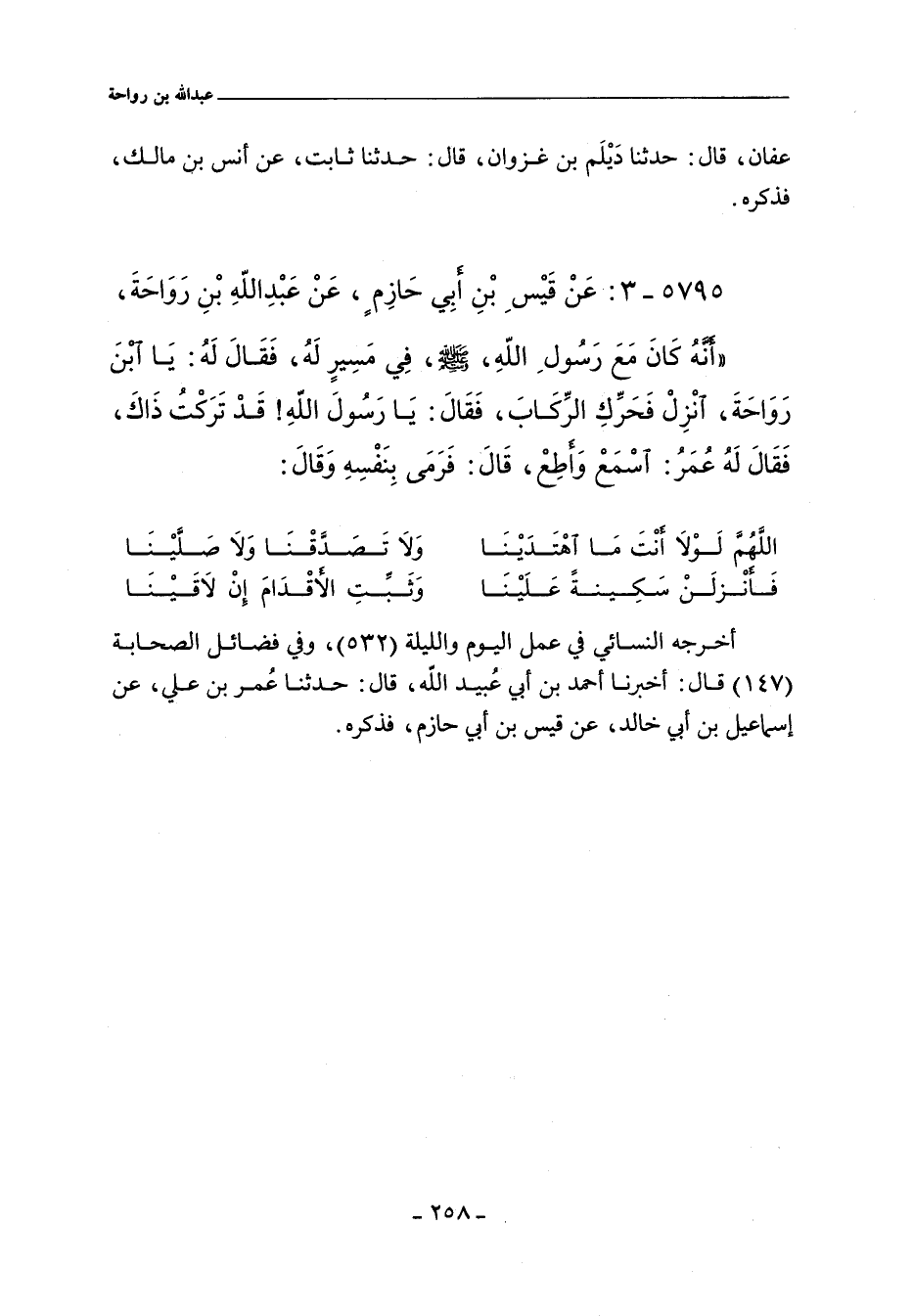 ٥٧٩٥ - عَنْ قَيْسِ بْنِ أَبِي حَازِمٍ , عَنْ عَبْدِ اللهِ بْنِ رَوَاحَةَ؛