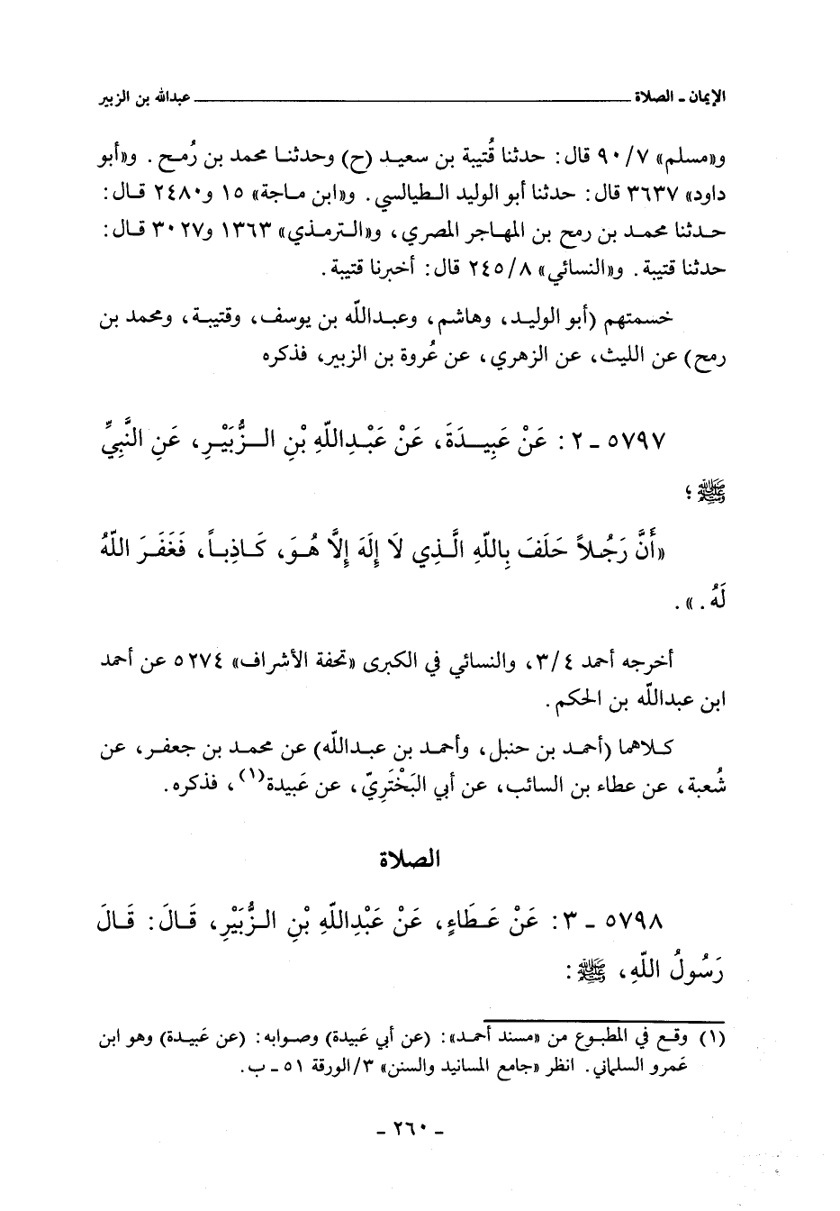 ٥٧٩٧ - عَنْ عَبِيدَةَ عَنْ عَبْدِ اللَّهِ بْنِ الزُّبَيْرِ عَنِ النَّبِىِّ صلى الله عليه وسلم؛