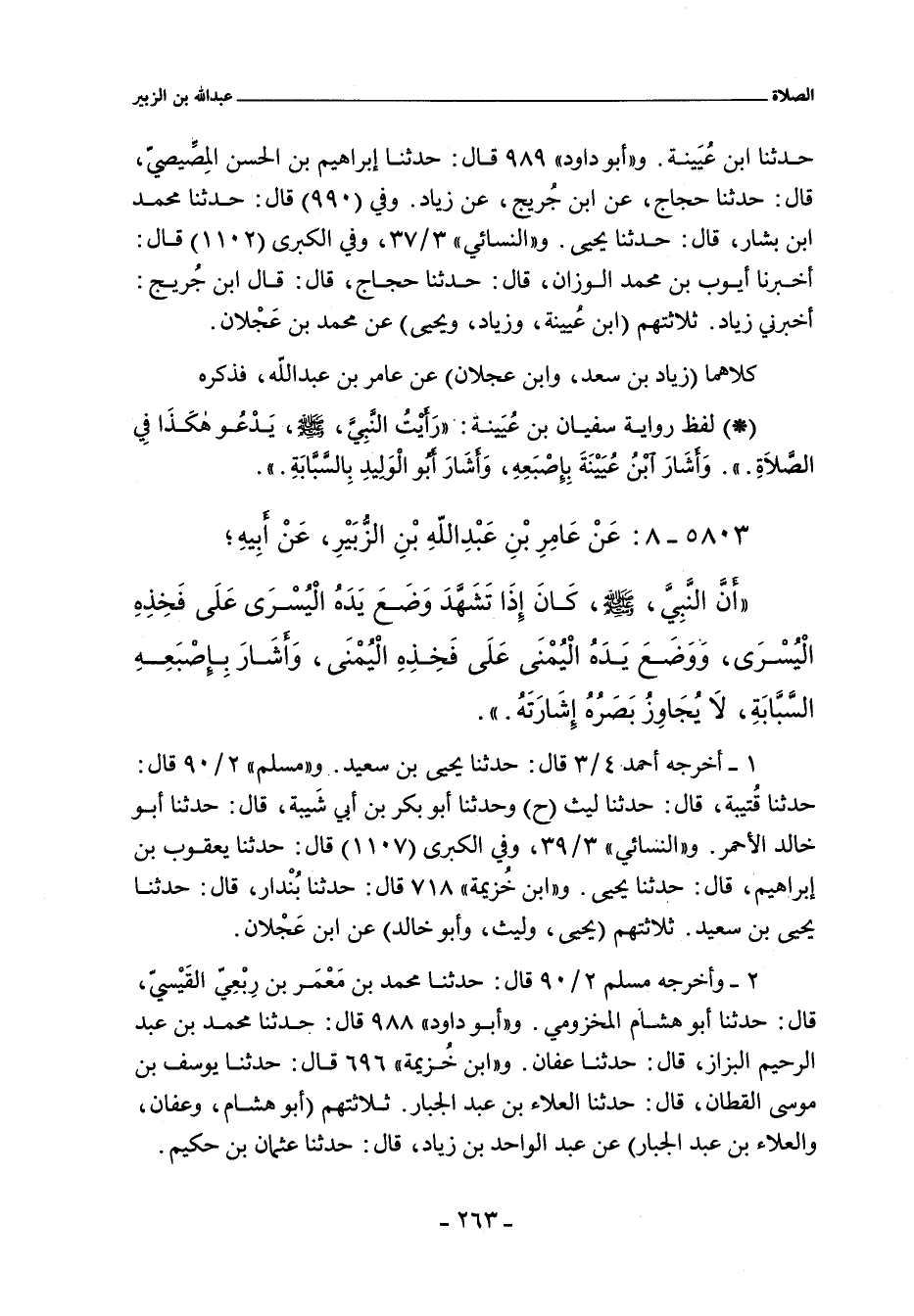 - وفي رواية: كَانَ رَسُولُ اللَّهِ صلى الله عليه وسلم إِذَا قَعَدَ فِى الصَّلَاةِ جَعَلَ قَدَمَهُ الْيُسْرَى بَيْنَ فَخِذِهِ وَسَاقِهِ وَفَرَشَ قَدَمَهُ الْيُمْنَى وَوَضَعَ يَدَهُ الْيُسْرَى عَلَى رُكْبَتِهِ الْيُسْرَى وَوَضَعَ يَدَهُ الْيُمْنَى عَلَى فَخِذِهِ الْيُمْنَى وَأَشَارَ بِإِصْبَعِهِ.