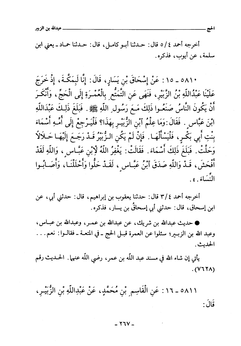٥٨١٠ - عن إِسْحَاقَ بْنِ يَسَارٍ , قَالَ: إِنَّا لَبِمَكَّةَ , إِذْ خَرَجَ عَلَيْنَا عَبْدُ اللَّهِ بْنُ الزُّبَيْرِ , فَنَهَى عَنِ التَّمَتُّعِ بِالْعُمْرَةِ إِلَى الْحَجِّ , وَأَنْكَرَ أَنْ يَكُونَ النَّاسُ صَنَعُوا ذَلِكَ مَعَ رَسُولِ اللَّهِ صلى الله عليه وسلم , فَبَلَغَ ذَلِكَ عَبْدَ اللَّهِ بْنَ عَبَّاسٍ , فَقَالَ وَمَا عِلْمُ ابْنِ الزُّبَيْرِ بِهَذَا؟ فَلْيَرْجِعْ إِلَى أُمِّهِ أَسْمَاءَ بِنْتِ أَبِى بَكْرٍ , فَلْيَسْأَلْهَا. فإن لم يكن الزبير قد رجع إليها حلالا وحلت. فبلغ ذلك أسماء. فقالت: يغفر الله لابن عباس , والله لقد أفحش , قد والله صدق ابن عباس , لقد حلوا وأحللنا , وأصابوا النساء.