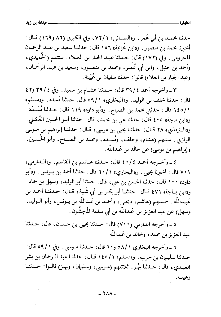حدثنا محمد بن أبِي عُمر، حدثنا سُفيان بن عُيَينَة. و"النَّسَائي" ١/ ٧١ قال: أخبرنا محمد بن سلمة، والحارث بن مسكين، قراءة عليه وأنا أسمع، عن ابن القاسم. قَالَ: حدثني مالك. وفي ١/ ٧١، وفي "الكبرى" ١٠٤ قال: أخبرنا عُتبة بن عبد الله، عن مالك، هو ابن أنس. وفي ١/ ٧٢، وفي "الكبرى" ٨٦ و ١٧١ قال: أخبرنا محمد بن منصور. قال: حدثنا سُفيان. و"ابن خزيمة" ١٥٥ قال: حدثنا محمد بن رافع، حدثنا عبد الرزاق , أخبرنا مالك. وفي (١٥٦) قال: حدثنا سعيد بن عبد الرحمن المخزومي , حدثنا سُفيان بن عُيَينَة. وفي (١٥٧) قال: حدثنا محمد بن رافع، حدثنا إسحاق بن عيسى. قال: سألتُ مالكا عن الرجل مسح مُقَدم رأسه في الوضوء أَيُجزيه ذلك؟. وفي (١٧٢) قال: حدثنا عبد الجبار بن العلاء، حدثنا سُفيان. وفي (١٧٣) قال: حدثنا يُونس بن عبد الأعلى، أخبرنا عبد الله بن وهب، أَن مالكا حَدثه.