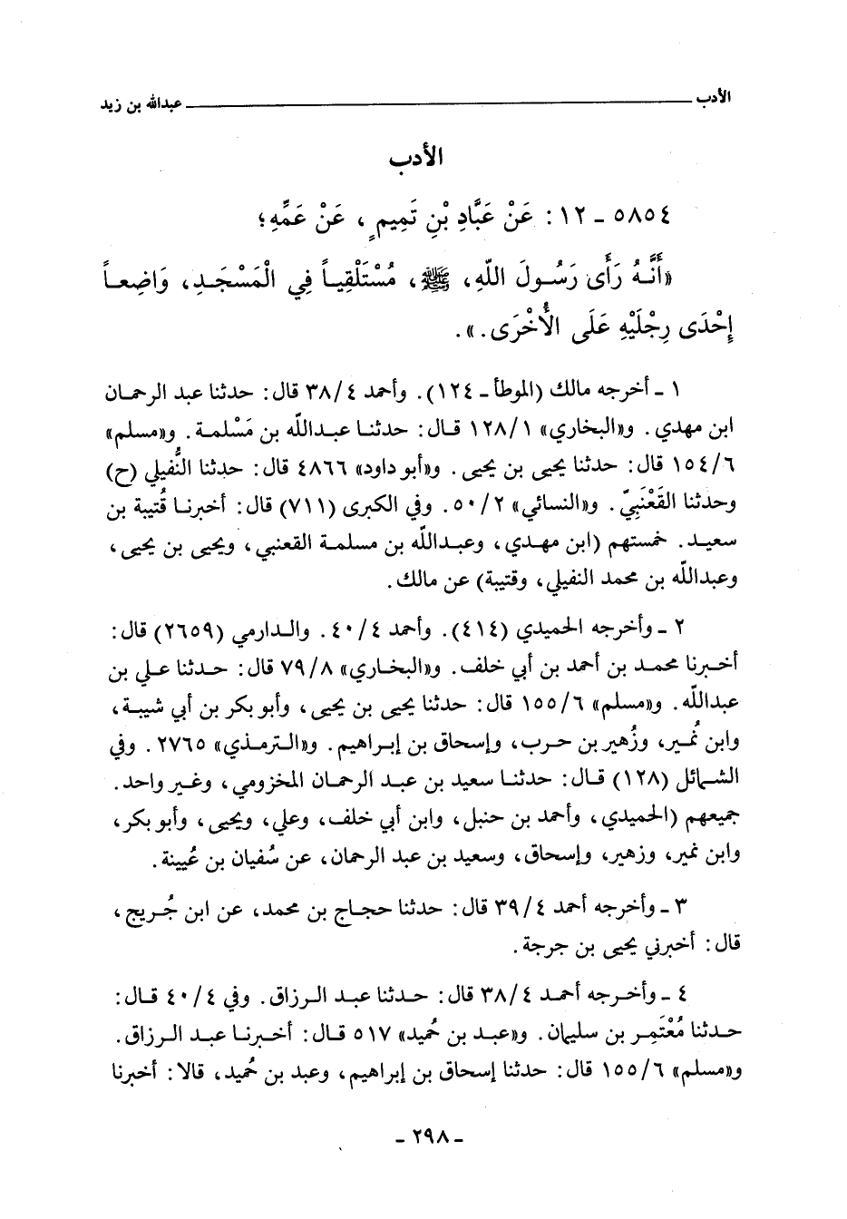 أَنَّهُ رَأَى رَسُولَ اللَّهِ صلى الله عليه وسلم مُسْتَلْقِيًا فِى الْمَسْجِدِ وَاضِعًا إِحْدَى رِجْلَيْهِ عَلَى الأُخْرَى.