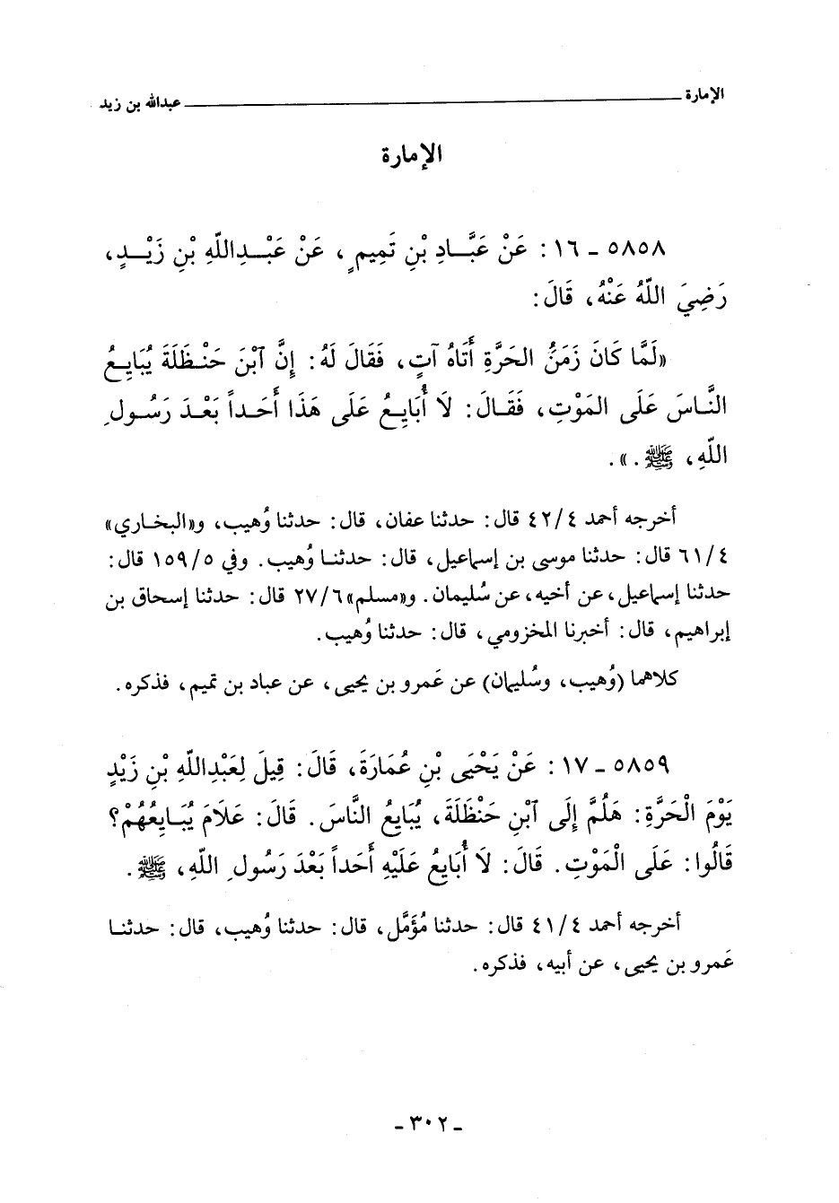 ٥٨٥٩ - عن يَحْيَى بن عمارة , قَالَ: قِيلَ لِعَبْدِ اللَّهِ بْنِ زَيْدٍ , يَوْمَ الْحَرَّةِ: هَلُمَّ إِلَى ابْنِ حَنْظَلَةَ , يُبَايِعُ النَّاسَ. قَالَ: عَلَامَ يُبَايِعُهُمْ؟ قَالُوا: عَلَى الْمَوْتِ. قَالَ: لَا أُبَايِعُ عَلَيْهِ أَحَدًا بَعْدَ رَسُولِ اللَّهِ صلى الله عليه وسلم.