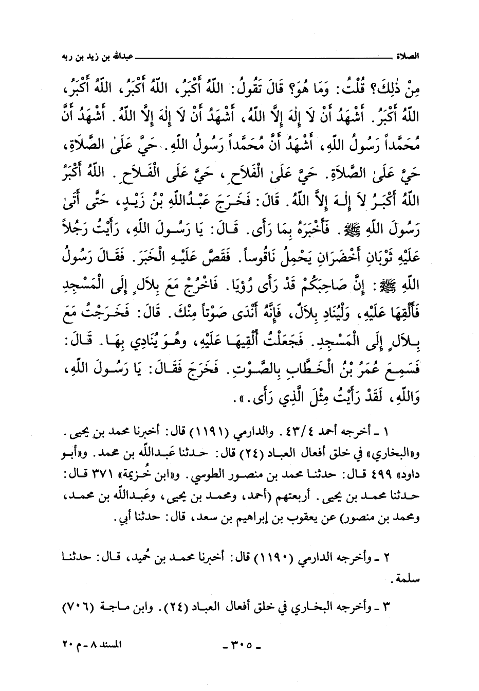 مِنْ ذَلِكَ قُلْتُ وَمَا هُوَ قَالَ تَقُولُ اللَّهُ أَكْبَرُ اللَّهُ أَكْبَرُ اللَّهُ أَكْبَرُ اللَّهُ أَكْبَرُ أَشْهَدُ أَنْ لَا إِلَهَ إِلَاّ اللَّهُ أَشْهَدُ أَنْ لَا إِلَهَ إِلَاّ اللَّهُ أَشْهَدُ أَنَّ مُحَمَّدًا رَسُولُ اللَّهِ أَشْهَدُ أَنَّ مُحَمَّدًا رَسُولُ اللَّهِ حَىَّ عَلَى الصَّلَاةِ حَىَّ عَلَى الصَّلَاةِ حَىَّ عَلَى الْفَلَاحِ حَىَّ عَلَى الْفَلَاحِ اللَّهُ أَكْبَرُ اللَّهُ أَكْبَرُ لَا إِلَهَ إِلَاّ اللَّهُ قَالَ فَخَرَجَ عَبْدُ اللَّهِ بْنُ زَيْدٍ حَتَّى أَتَى رَسُولَ اللَّهِ صلى الله عليه وسلم فَأَخْبَرَهُ بِمَا رَأَى قَالَ يَا رَسُولَ اللَّهِ رَأَيْتُ رَجُلاً عَلَيْهِ ثَوْبَانِ أَخْضَرَانِ يَحْمِلُ نَاقُوسًا فَقَصَّ عَلَيْهِ الْخَبَرَ فَقَالَ رَسُولُ اللَّهِ صلى الله عليه وسلم إِنَّ صَاحِبَكُمْ قَدْ رَأَى رُؤْيَا فَاخْرُجْ مَعَ بِلَالٍ إِلَى الْمَسْجِدِ فَأَلْقِهَا عَلَيْهِ وَلْيُنَادِ بِلَالٌ فَإِنَّهُ أَنْدَى صَوْتًا مِنْكَ قَالَ فَخَرَجْتُ مَعَ بِلَالٍ إِلَى الْمَسْجِدِ فَجَعَلْتُ أُلْقِيهَا عَلَيْهِ وَهُوَ يُنَادِى بِهَا قَالَ فَسَمِعَ عُمَرُ بْنُ الْخَطَّابِ بِالصَّوْتِ فَخَرَجَ فَقَالَ يَا رَسُولَ اللَّهِ وَاللَّهِ لَقَدْ رَأَيْتُ مِثْلَ الَّذِى رَأَى.