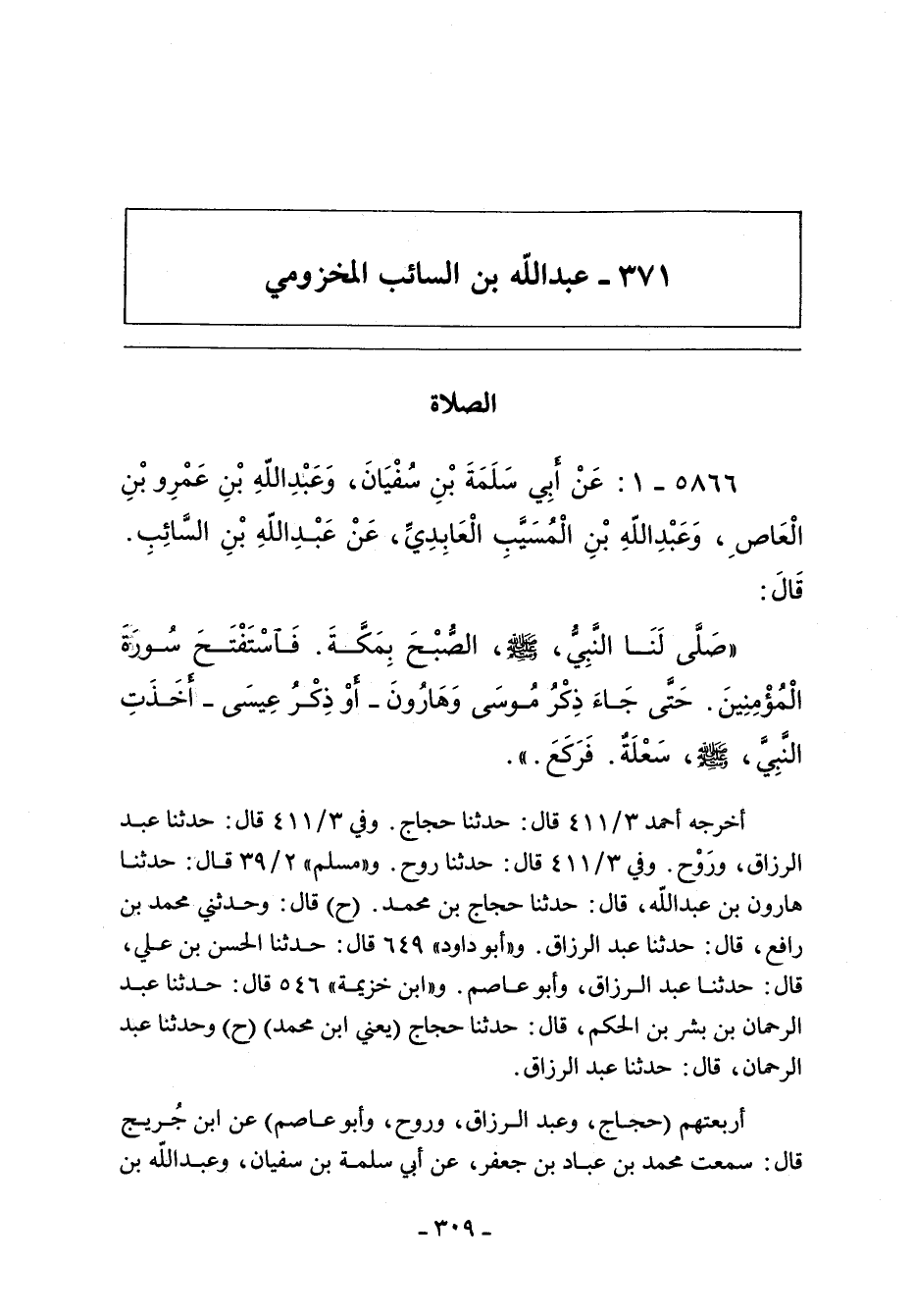 ٥٨٦٦ - عَنْ أَبِى سَلَمَةَ بْنُ سُفْيَانَ وَعَبْدُ اللَّهِ بْنُ الْمُسَيَّبِ الْعَابِدِىُّ وَعَبْدُ اللَّهِ بْنُ عَمْرٍو عَنْ عَبْدِ اللَّهِ بْنِ السَّائِبِ قَالَ: