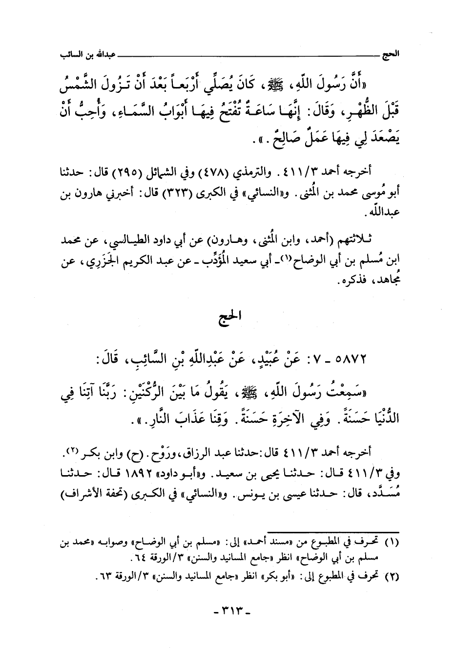 ٥٨٧٢ - عَنْ عُبَيْدٍ , مَوْلَى السَّائِبِ , الْمَخْزُومِيِّ , عَنْ عَبْدِ اللَّهِ بْنِ السَّائِبِ , قَالَ: