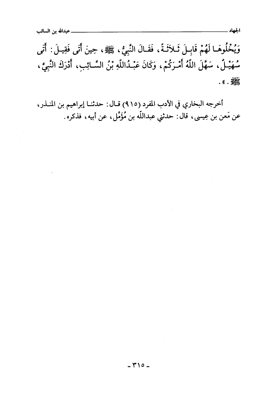 وَيُخلُوهَا لَهُم قَابِلَ ثَلَاثَةَ، فَقَالَ النبِيُّ، صلى الله عليه وسلم، حِينَ أَتَى فَقِيلَ: أَتَى سُهَيْل: سَهلَ الله أَمْرَكُمْ، وَكَانَ عبد الله بنُ السائب، أَدرَكَ النُّبِي، صلى الله عليه وسلم.