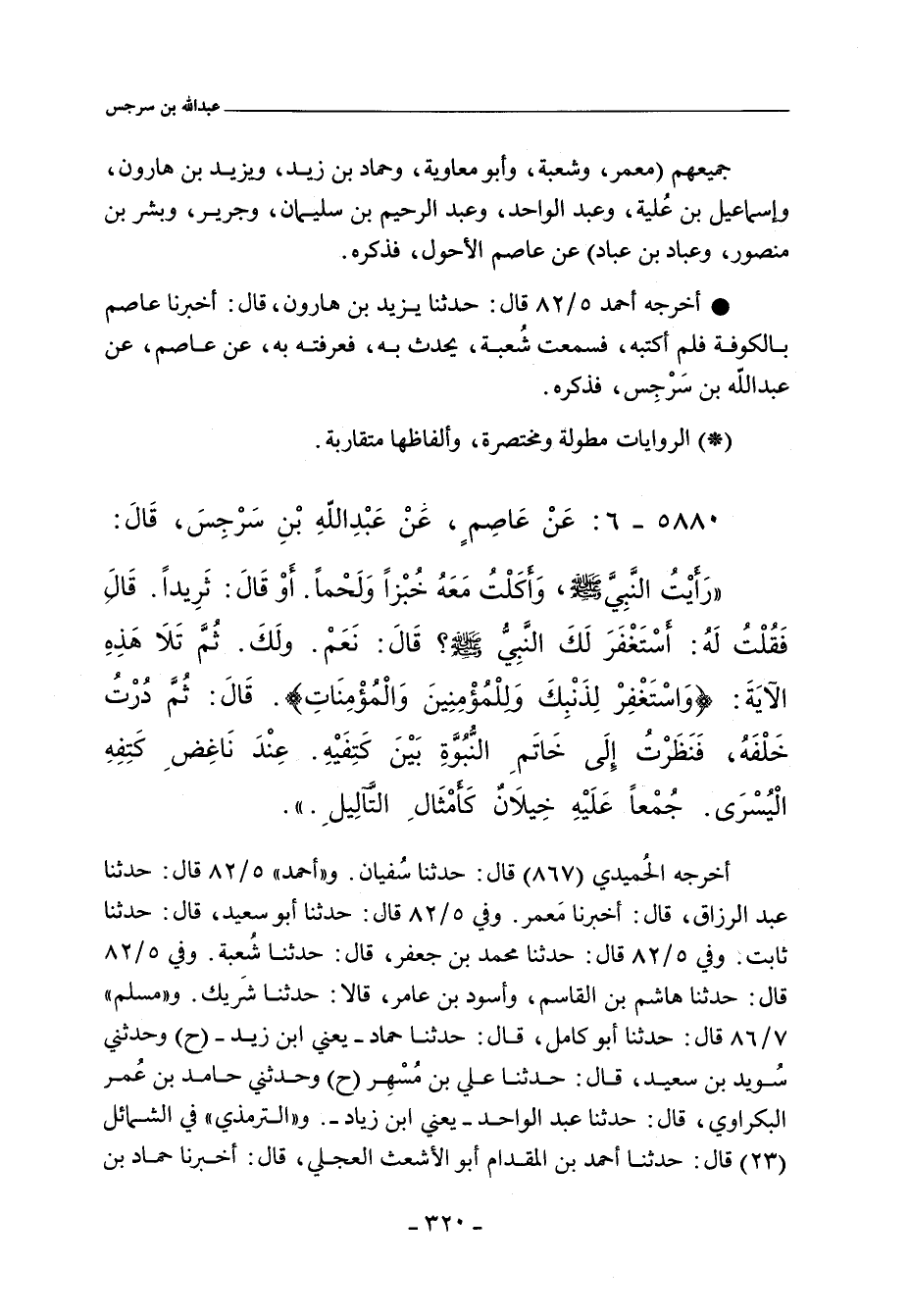 - وفي (٢١٠٦٢): عن عبد الله بن سرجس؛ أنه كان رأى النبي صلى الله عليه وسلم.