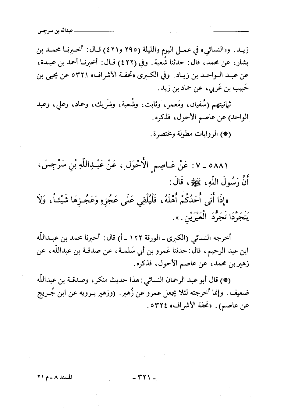 - وأخرجه أحمد ٥/ ٨٢ (٢١٠٦٠) قال: حدثنا بكر بن عيسى، أبو بشر الراسبي، حدَّثنا ثابت أبو زيد القيسي، عن عاصم الأحول، أنه قال: قد رأى عبد الله بن سرجس النبيَّ صلى الله عليه وسلم، غير أنه لم تكن له صحبة.