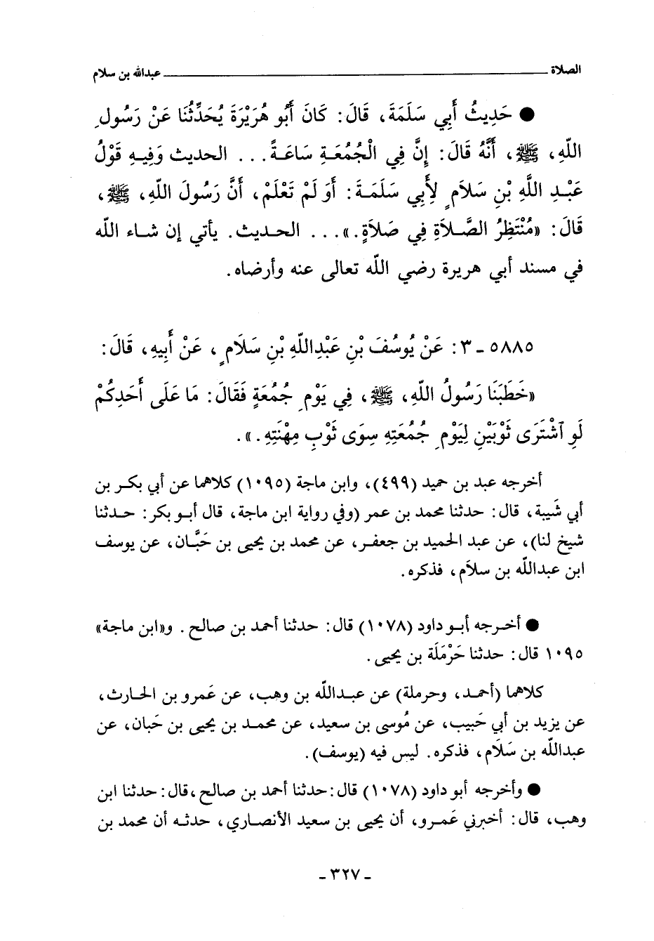 حَدِيثُ أَبِى سَلَمَةَ , قَالَ: كَانَ أبو هُرَيْرَةَ يُحَدِّثُنَا عَنْ رَسُولِ اللَّهِ , صلى الله عليه وسلم , أَنَّهُ قَالَ: إِنَّ فِى الْجُمُعَةِ سَاعَةً. الْحَدِيثَ قَوْلُ عَبْدِ اللَّهِ بْنِ سَلَامٍ لأَبِي سَلَمَةَ: أَوَلَمْ تَعْلَمْ , أَنَّ رَسُولَ اللَّهِ , صلى الله عليه وسلم , قَالَ: مُنْتَظِرُ الصَّلَاةِ فِى صَلَاةٍ. الحديث. يأتي إن شاء الله في مسند أبِي هريرة رضي الله تعالى عنه وأرضاه.
