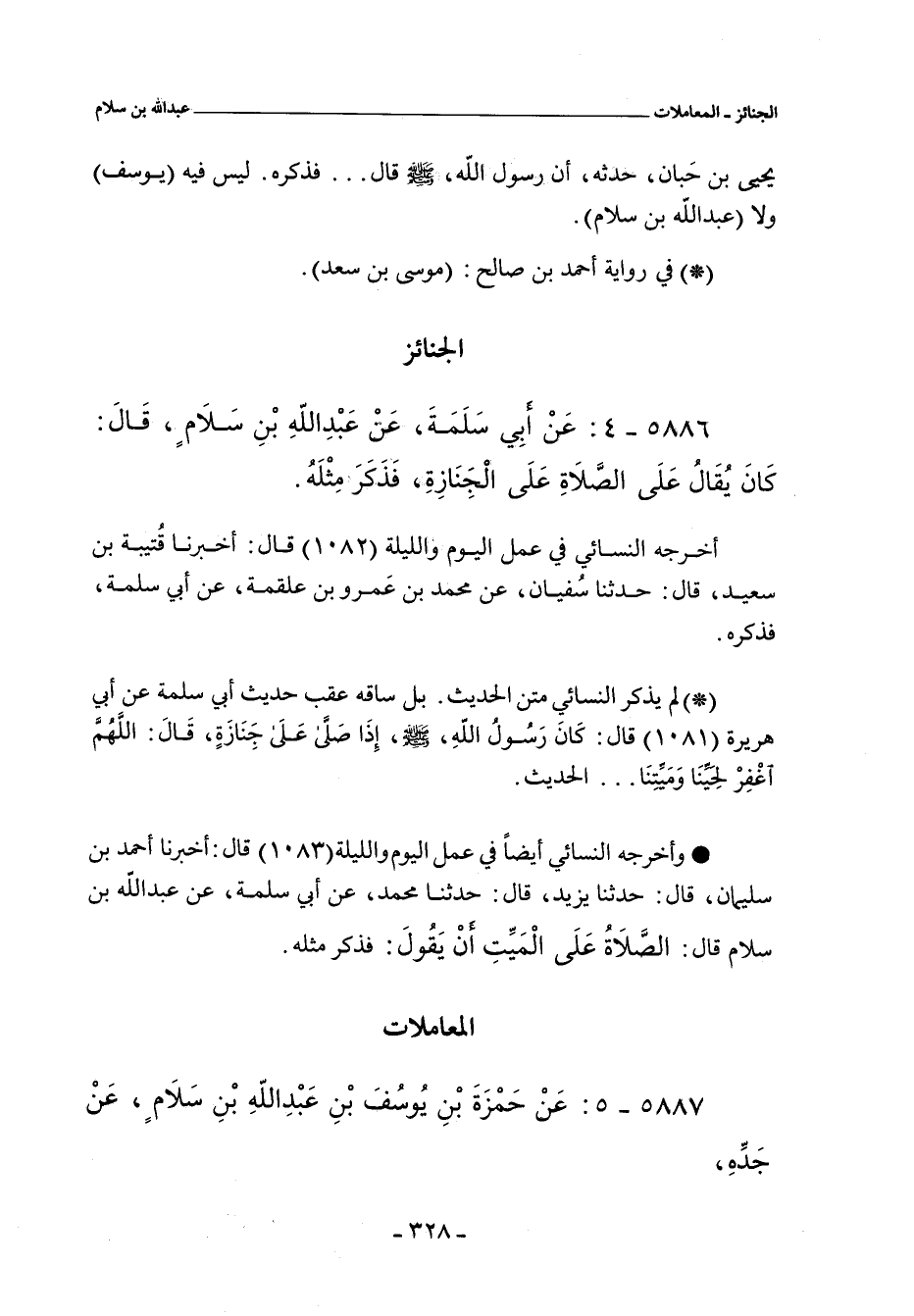 - وأخرجه النسائي أيضا في عمل اليوم والليلة (١٠٨٣) قال: أخبرنا أحمد بن سليمان , قال: حدثنا يزيد , قال: حدثنا محمد , عن أبي سلمة , عن عبد الله بن سلام قال: الصلاة على الميت أن يقول: فذكر مثله.