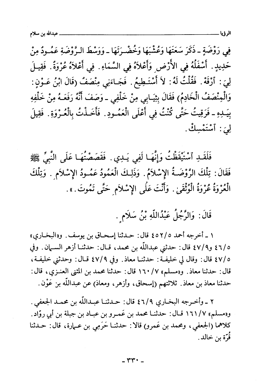 فِى رَوْضَةٍ ذَكَرَ سَعَتَهَا وَعُشْبَهَا وَخُضْرَتَهَا وَوَسْطَ الرَّوْضَةِ عَمُودٌ مِنْ حَدِيدٍ أَسْفَلُهُ فِى الأَرْضِ وَأَعْلَاهُ فِى السَّمَاءِ فِى أَعْلَاهُ عُرْوَةٌ فَقِيلَ لِى ارْقَهْ فَقُلْتُ لَهُ لَا أَسْتَطِيعُ فَجَاءَنِى مِنْصَفٌ قَالَ ابْنُ عَوْنٍ وَالْمِنْصَفُ الْخَادِمُ فَقَالَ بِثِيَابِى مِنْ خَلْفِى وَصَفَ أَنَّهُ رَفَعَهُ مِنْ خَلْفِهِ بِيَدِهِ فَرَقِيتُ حَتَّى كُنْتُ فِى أَعْلَى الْعَمُودِ فَأَخَذْتُ بِالْعُرْوَةِ فَقِيلَ لِىَ اسْتَمْسِكْ فَلَقَدِ اسْتَيْقَظْتُ وَإِنَّهَا لَفِى يَدِى فَقَصَصْتُهَا عَلَى النَّبِىِّ صلى الله عليه وسلم فَقَالَ تِلْكَ الرَّوْضَةُ الإِسْلَامُ وَذَلِكَ الْعَمُودُ عَمُودُ الإِسْلَامِ وَتِلْكَ الْعُرْوَةُ عُرْوَةُ الْوُثْقَى وَأَنْتَ عَلَى الإِسْلَامِ حَتَّى تَمُوتَ.