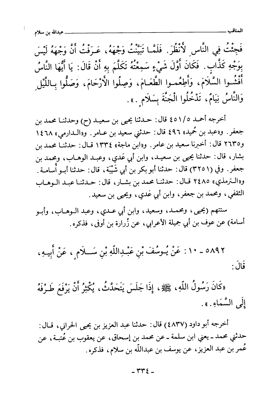 فَجِئْتُ فِى النَّاسِ لأَنْظُرَ فَلَمَّا تَبَيَّنْتُ وَجْهَهُ عَرَفْتُ أَنَّ وَجْهَهُ لَيْسَ بِوَجْهِ كَذَّابٍ فَكَانَ أَوَّلَ شَىْءٍ سَمِعْتُهُ تَكَلَّمَ بِهِ أَنْ قَالَ يَا أَيُّهَا النَّاسُ أَفْشُوا السَّلَامَ وَأَطْعِمُوا الطَّعَامَ وَصِلُوا الأَرْحَامَ وَصَلُّوا بِاللَّيْلِ وَالنَّاسُ نِيَامٌ تَدْخُلُوا الْجَنَّةَ بِسَلَامٍ.