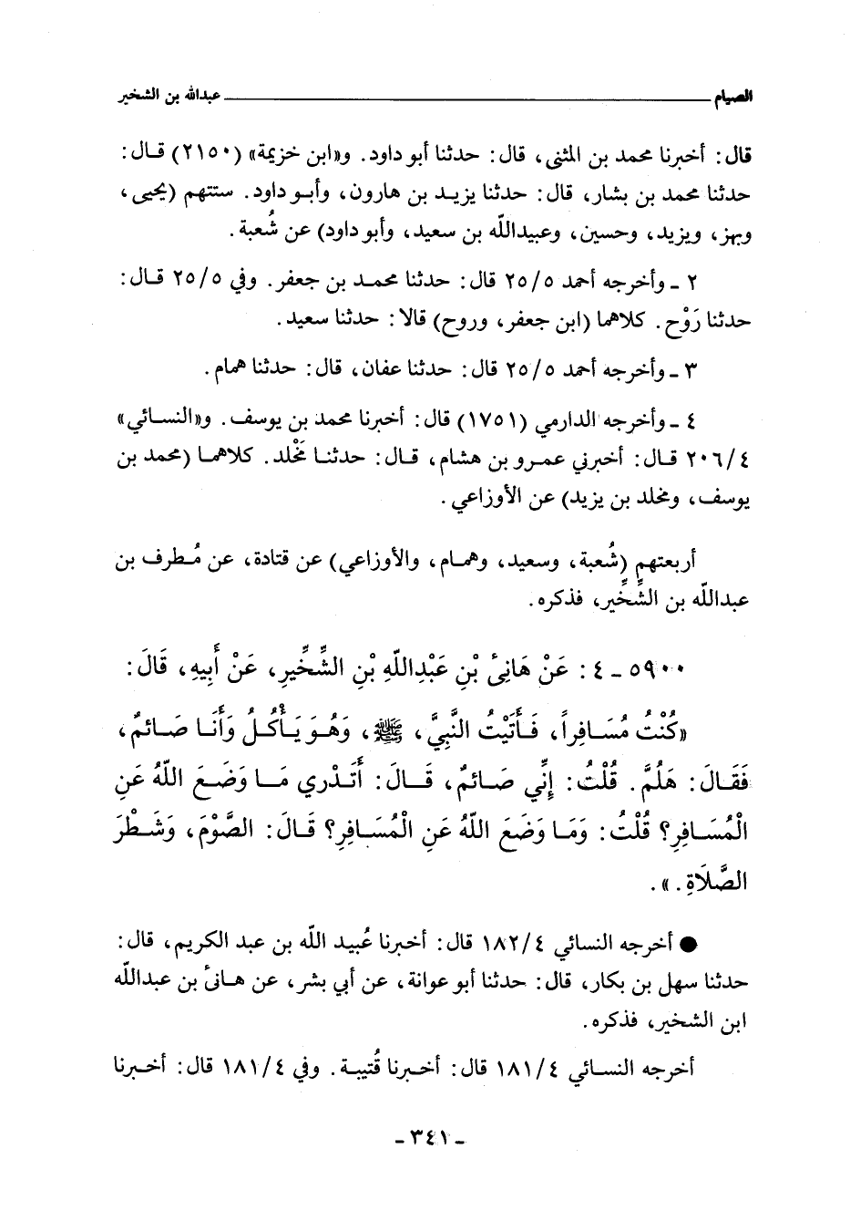 قال: أخبرنا محمد بن المُثنى. قال: حدثنا أبو داود. قال: حدثنا شُعبة. وفي "الكبرى" ٢٦٩٥ قال: أخبرني عَمرو بن هشام. قال: حدَّثنا مَخلد، عن الأَوزاعي. و"ابن خزيمة" ٢١٥٠ قال: حدثنا محمد بن بَشار، حدثنا يزيد بن هارون، وأبو داود. قالا: حدثنا شُعبة.