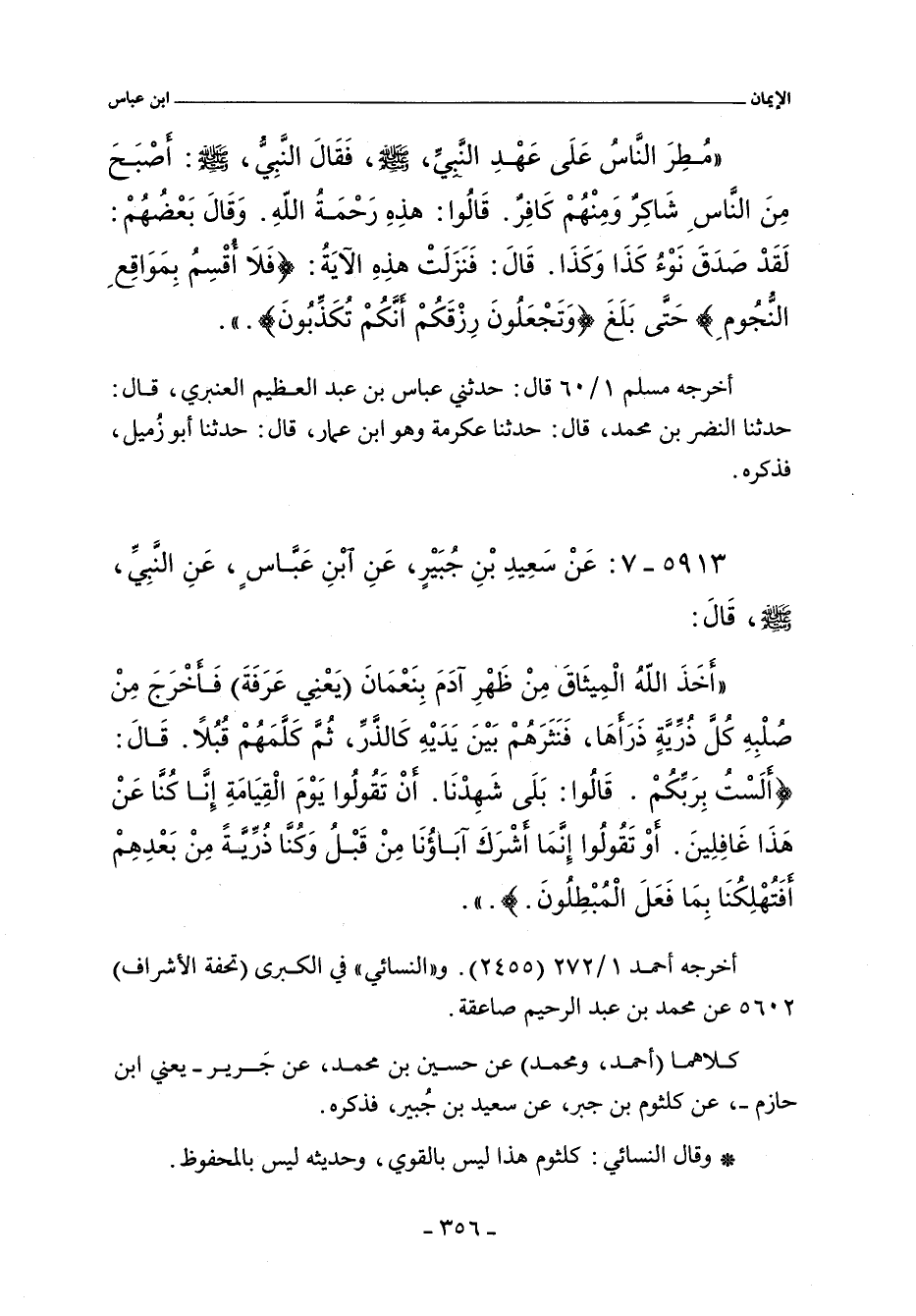 أَخَذَ اللَّهُ الْمِيثَاقَ مِنْ ظَهْرِ آدم بِنَعْمَانَ - يَعْنِى عَرَفَةَ - فَأَخْرَجَ مِنْ صُلْبِهِ كُلَّ ذُرِّيَّةٍ ذَرَأَهَا فَنَثَرَهُمْ بَيْنَ يَدَيْهِ كَالذَّرِّ ثُمَّ كَلَّمَهُمْ قِبَلاً قَالَ (أَلَسْتُ بِرَبِّكُمْ قَالُوا بَلَى شَهِدْنَا أَنْ تَقُولُوا يَوْمَ الْقِيَامَةِ إِنَّا كُنَّا عَنْ هَذَا غَافِلِينَ أَوْ تَقُولُوا إِنَّمَا أَشْرَكَ آبَاؤُنَا مِنْ قَبْلُ وَكُنَّا ذُرِّيَّةً مِنْ بَعْدِهِمْ أَفَتُهْلِكُنَا بِمَا فَعَلَ الْمُبْطِلُونَ).