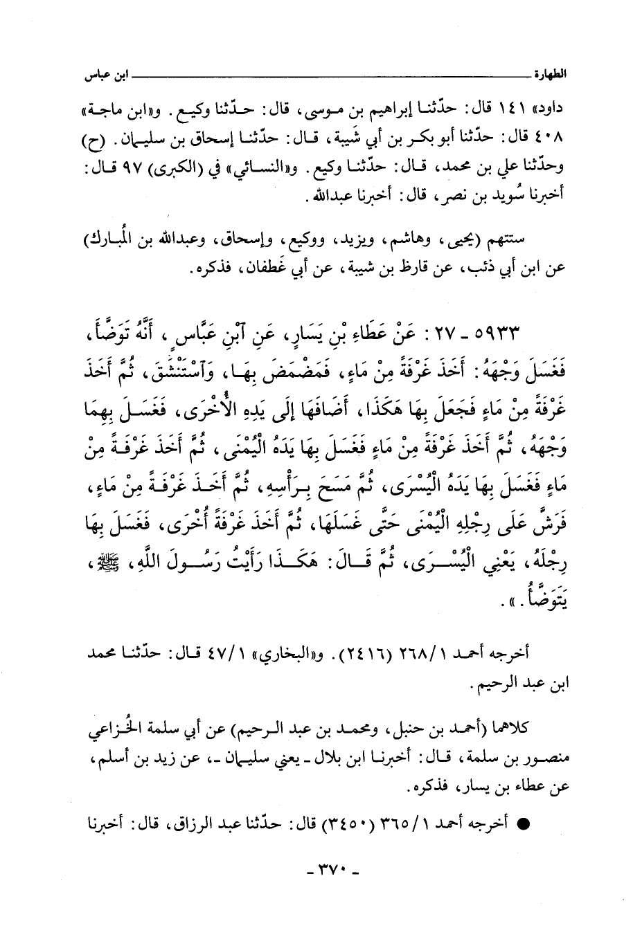 ٥٩٣٣ - عَنْ عَطَاءِ بْنِ يَسَارٍ عَنِ ابْنِ عَبَّاسٍ , أَنَّهُ تَوَضَّأَ فَغَسَلَ وَجْهَهُ، ثُمَّ أَخَذَ غَرْفَةً مِنْ مَاءٍ، فَمَضْمَضَ بِهَا وَاسْتَنْشَقَ، ثُمَّ أَخَذَ غَرْفَةً مِنْ مَاءٍ، فَجَعَلَ بِهَا هَكَذَا، أَضَافَهَا إِلَى يَدِهِ الأُخْرَى، فَغَسَلَ بِهِمَا وَجْهَهُ، ثُمَّ أَخَذَ غَرْفَةً مِنْ مَاءٍ، فَغَسَلَ بِهَا يَدَهُ الْيُمْنَى، ثُمَّ أَخَذَ غَرْفَةً مِنْ مَاءٍ، فَغَسَلَ بِهَا يَدَهُ الْيُسْرَى، ثُمَّ مَسَحَ بِرَأْسِهِ، ثُمَّ أَخَذَ غَرْفَةً مِنْ مَاءٍ فَرَشَّ عَلَى رِجْلِهِ الْيُمْنَى حَتَّى غَسَلَهَا، ثُمَّ أَخَذَ غَرْفَةً أُخْرَى، فَغَسَلَ بِهَا رِجْلَهُ يَعْنِى الْيُسْرَى ثُمَّ قَالَ هَكَذَا رَأَيْتُ رَسُولَ اللَّهِ صلى الله عليه وسلم يَتَوَضَّأُ.