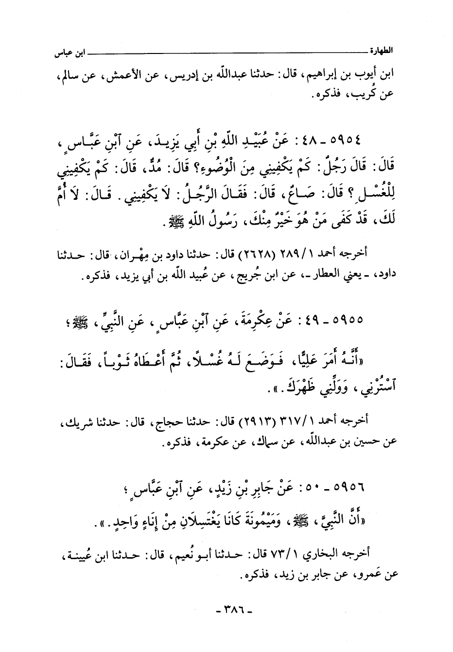 ٥٩٥٤ - عَنْ عُبَيْدِ اللَّهِ بْنِ أَبِي يَزِيدَ عَنِ ابْنِ عَبَّاسٍ قَالَ قَالَ رَجُلٌ كَمْ يَكْفِينِى مِنَ الْوُضُوءِ قَالَ مُدٌّ. قَالَ كَمْ يَكْفِينِى لِلْغُسْلِ قَالَ صَاعٌ. قَالَ فَقَالَ الرَّجُلُ لَا يَكْفِينِى. قَالَ لَا أُمَّ لَكَ قَدْ كَفَى مَنْ هُوَ خَيْرٌ مِنْكَ رَسُولَ اللَّهِ صلى الله عليه وسلم.