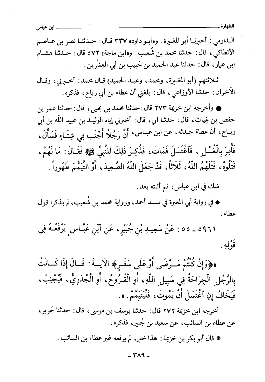 (وَإِنْ كُنْتُمْ مَرْضَى أَوْ عَلَى سَفَرٍ) الآيَةِ. قَالَ: إِذَا كَانَتْ بِالرَّجُلِ الْجِرَاحَةُ , فِى سَبِيلِ اللَّهِ , أَوِ الْقُرُوحُ , أَوِ الْجُدَرِىُّ , فَيُجْنِبُ , فَيَخَافُ إِنِ اغْتَسَلَ أَنْ يَمُوتَ , فَلْيَتَيَمَّمْ.