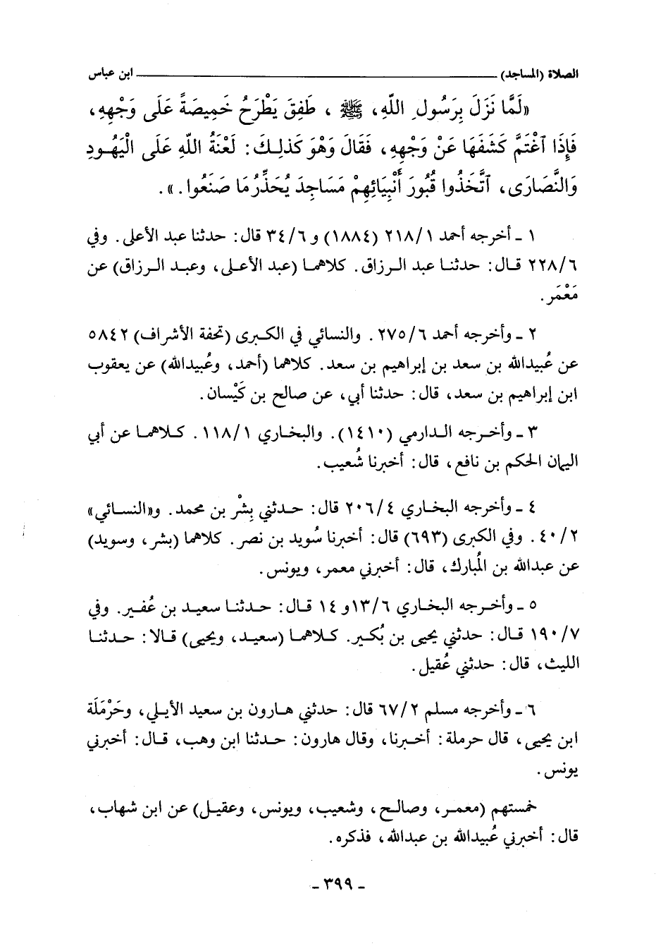 لَمَّا نَزَلَ بِرَسُولِ اللَّهِ صلى الله عليه وسلم طَفِقَ يَطْرَحُ خَمِيصَةً لَهُ عَلَى وَجْهِهِ، فَإِذَا اغْتَمَّ بِهَا كَشَفَهَا عَنْ وَجْهِهِ، فَقَالَ وَهْوَ كَذَلِكَ لَعْنَةُ اللَّهِ عَلَى الْيَهُودِ وَالنَّصَارَى اتَّخَذُوا قُبُورَ أَنْبِيَائِهِمْ مَسَاجِدَ يُحَذِّرُ مَا صَنَعُوا.